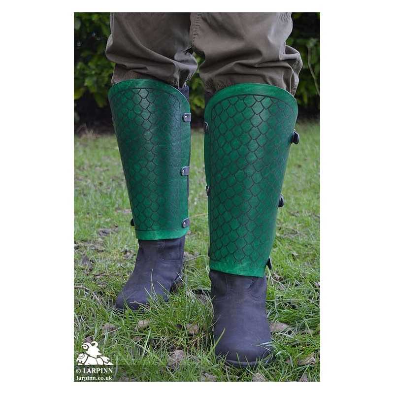 These hand painted greaves are made at Larp Inn, in the UK. These greaves are etched and hand dyed by us, providing beautiful quality and a unique finish on every pair. The sealed veg-tan leather used makes them perfect for Medium Armour Use at most Larp Systems.These greaves have been designed to provide an optimal fit for both male and female wearers. The length ensures the greave doesn't rub the ankle or cover the knee on smaller legs. The wide shape helps to offer maximum coverage.