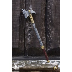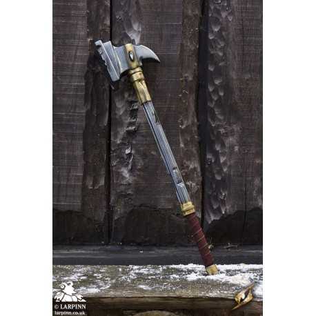 Epic Armoury’s Guardian is a high-fantasy latex warhammer with rich, sculpted and handpainted detailing. The Guardian’s head is 9 cm wide, with a 15 x 15 cm face designed to deliver a fatal blow to your enemies. An 8 cm claw-like spike serves as the peen of the hammer, opposite the face. Sculpted and handpainted, the head of this hammer appears fitted to the haft through a jeweled metal bar. This detailed metal attaches to the steel-coloured haft and the 12 cm handle wrapped in split-leather for a comfortable and secure grip.