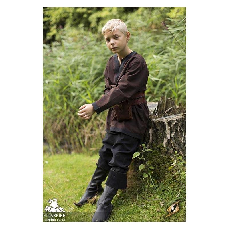 The Guy Tunic is a light Viking-style shirt often worn as an undergarment, with a large V-shaped neckline. Reaching from the shoulders to the mid-thighs and made from comfortable, dyed cotton, this tunic is an extremely versatile item that can be a costume all by itself--or work as a base layer in a more complicated design. Hemmed with black cotton and made from durable fabric, this neutral cut tunic is an essential and long-lasting piece in any costuming wardrobe.