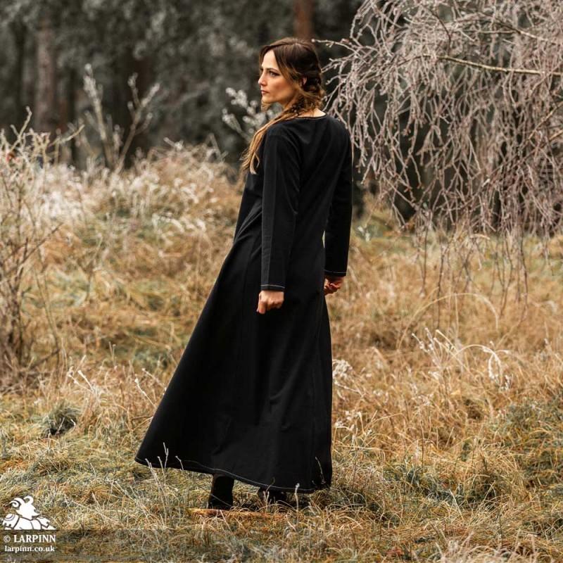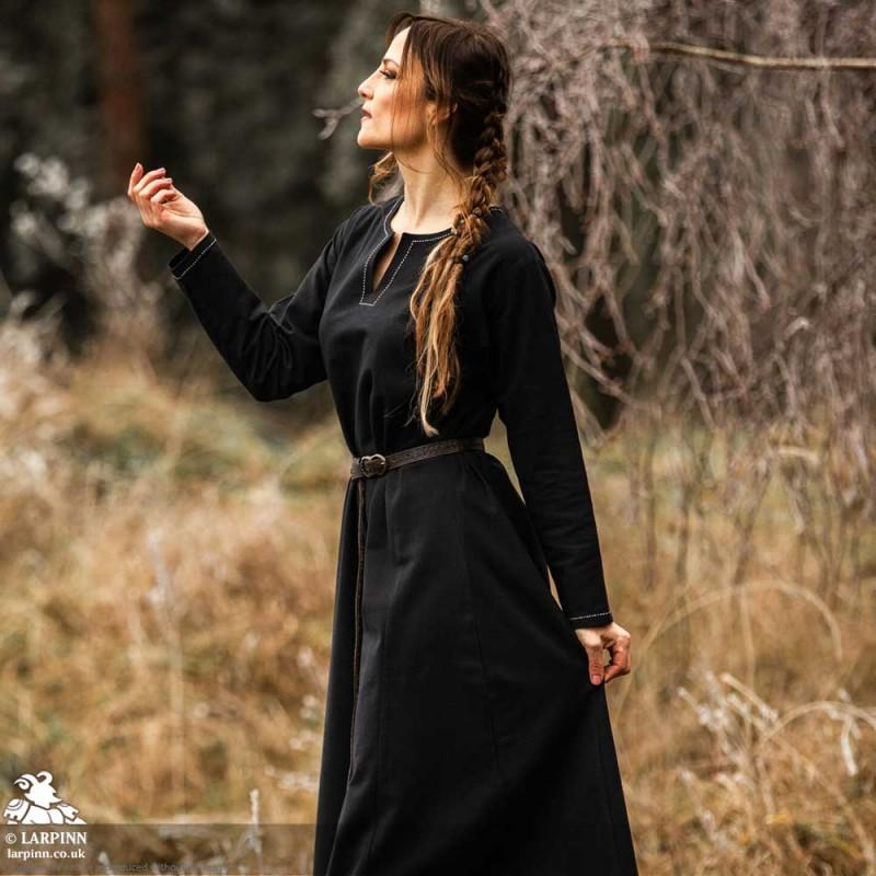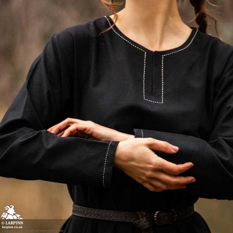 Step into a world of saga tales and legends with our Helga Dress, your perfect viking under dress for epic adventures. This elegantly crafted garment showcases intricate decorative stitching at the collar, cuffs, and hemline, enhancing its long, flowing silhouette. The simple yet sophisticated round neckline with a small V-shaped slit offers a hint of elegance that flatters the décolleté. Designed to end just above the ankles, this dress assures a relaxed fit for unparalleled comfort and freedom of movement. Let this enchanting piece be your go-to attire as you prepare to embark on journeys filled with wonder.
