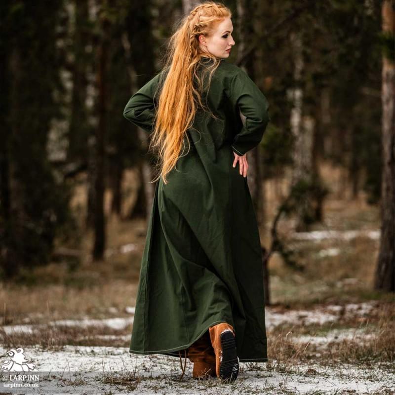 Step into a world of saga tales and legends with our Helga Dress, your perfect viking under dress for epic adventures. This elegantly crafted garment showcases intricate decorative stitching at the collar, cuffs, and hemline, enhancing its long, flowing silhouette. The simple yet sophisticated round neckline with a small V-shaped slit offers a hint of elegance that flatters the décolleté. Designed to end just above the ankles, this dress assures a relaxed fit for unparalleled comfort and freedom of movement. Let this enchanting piece be your go-to attire as you prepare to embark on journeys filled with wonder.