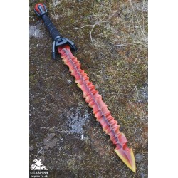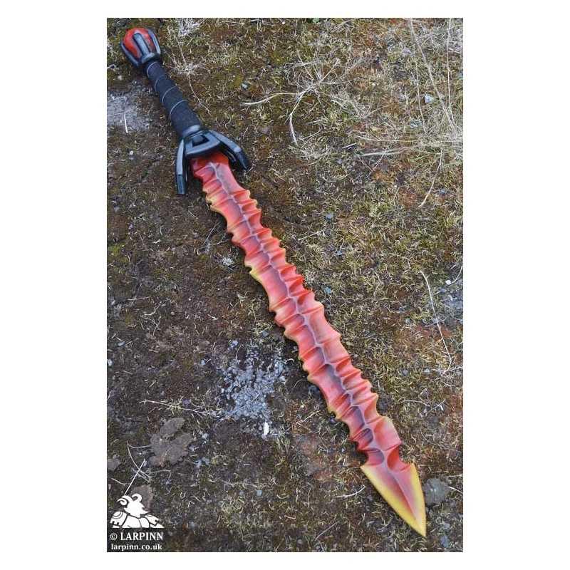 Epic Armoury’s Hellfire is a medium length sword designed as part of the Orc Universe collection. Carefully handpainted deep gradient reds and oranges, Hellfire appears to be burning from intense magic. The 60 cm double-edged blade is notched and worn, connected to a dark metal coloured crossguard which protects the 15 cm ergonomic handle. The handle is wrapped in split-leather for a secure and comfortable grip, and ends with a crudely gemmed pommel.