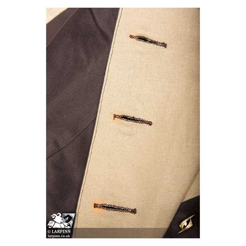 The Helsing Coat is a sleek and long-sleeved duster with an impressive mantle designed for magic hunters. Reaching from the neck to the mid-calf, this coat is designed to protect you from the elements while adding a serious, professional appearance. The coat is made from brown canvas and embellished with a contrasting lining. The slit up the back provides better movement, including comfort on horseback.