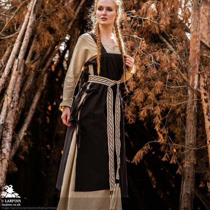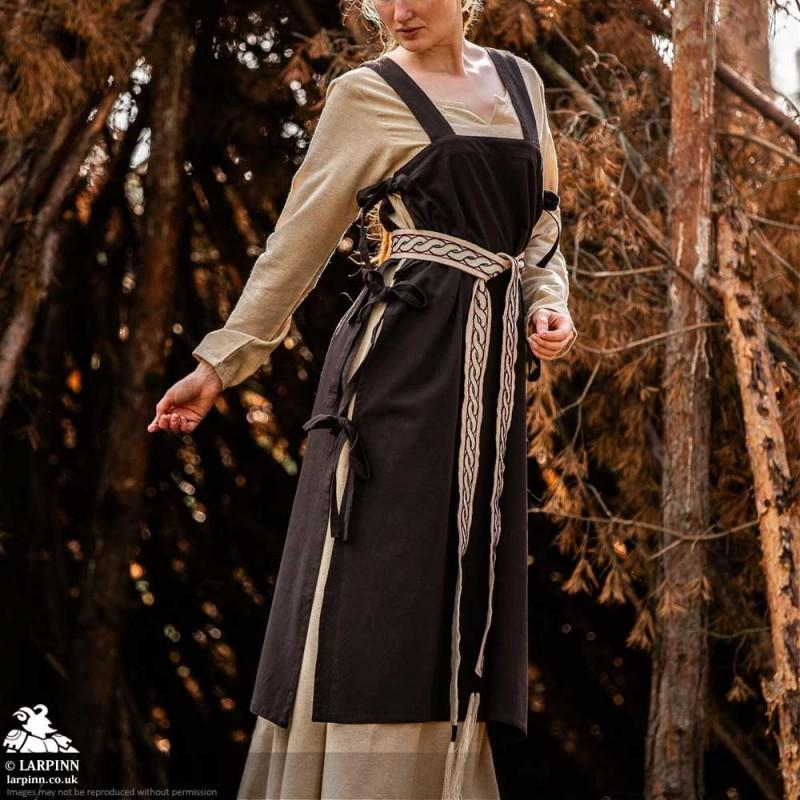 Step into the enchanting world of viking times with our stunning Hildegard Overdress. This sleeveless, full-length garment is inspired by historical designs. Its simple yet elegant straight silhouette and wide shoulder straps create a look reminiscent of noble attire. The apron-like design wraps gracefully around your form, secured at the sides with functional ties for an adjustable fit.