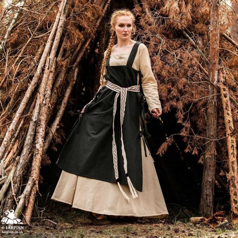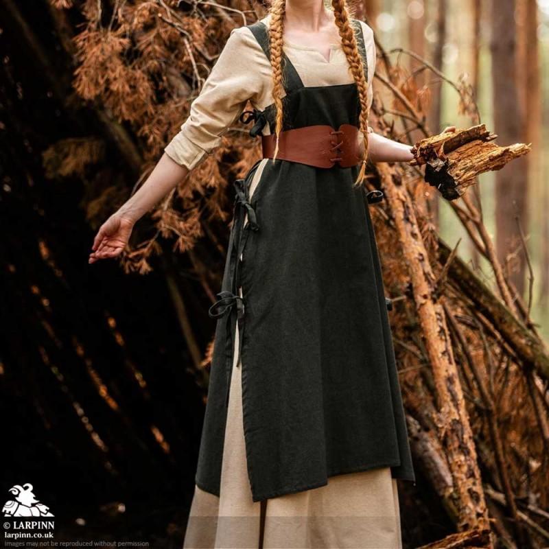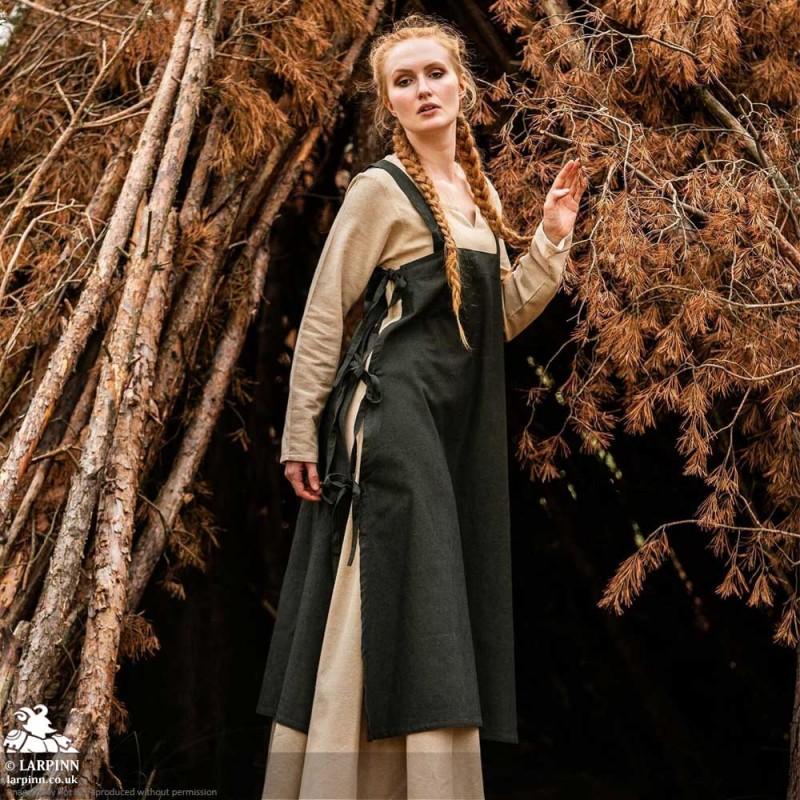 Step into the enchanting world of viking times with our stunning Hildegard Overdress. This sleeveless, full-length garment is inspired by historical designs. Its simple yet elegant straight silhouette and wide shoulder straps create a look reminiscent of noble attire. The apron-like design wraps gracefully around your form, secured at the sides with functional ties for an adjustable fit.