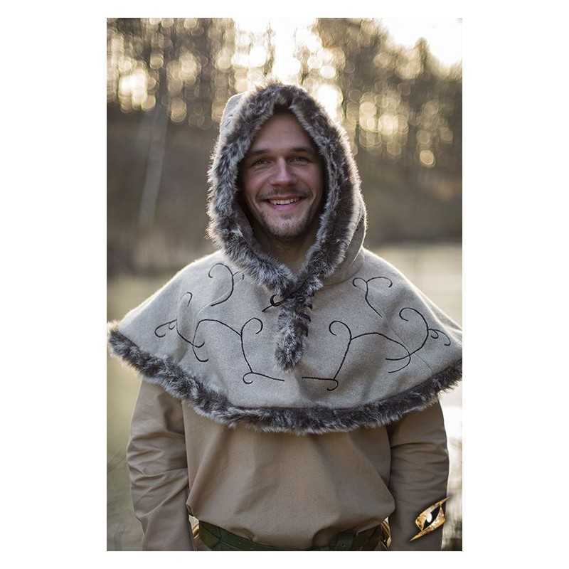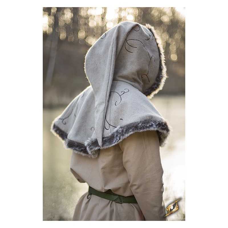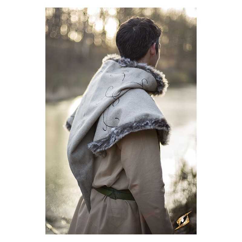Epic Armoury’s Fur Hood is an embroidered mantle with a long hood tail. The mantle covers the shoulders, keeping the upper chest warm while the hood protects the head and face from harsh wind. Elvish embroidery and polyester fur trim embellishes this hood, adding great detail to the felted wool. The inside is lined with soft, comfortable cotton.