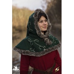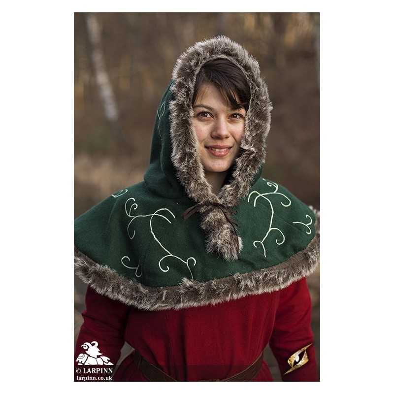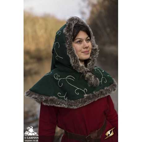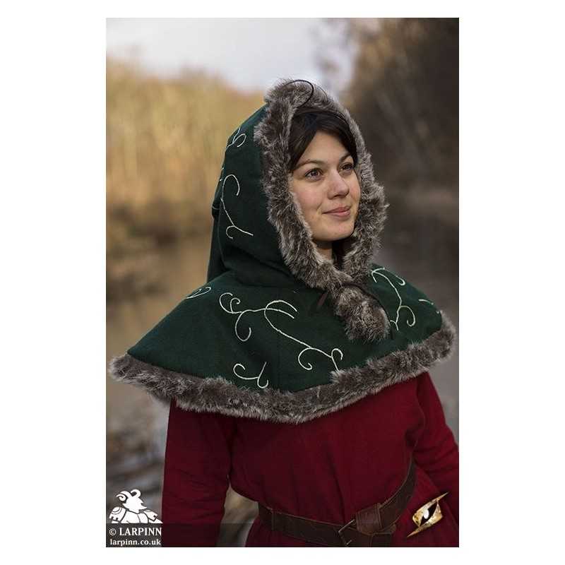 Epic Armoury’s Fur Hood is an embroidered mantle with a long hood tail. The mantle covers the shoulders, keeping the upper chest warm while the hood protects the head and face from harsh wind. Elvish embroidery and polyester fur trim embellishes this hood, adding great detail to the felted wool. The inside is lined with soft, comfortable cotton.