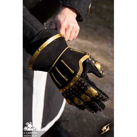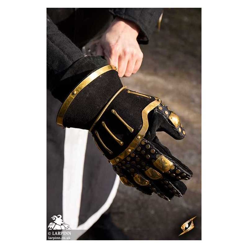The steel is decorated with black coloured split-leather and the gauntlet is worn via a leather glove underneath. The finger protection of the glove is sewn onto the leather glove, with a leather strap around the palm to secure the gauntlet onto the hand. Made from polished mild steel with rolled edges, these gauntlets are impressive in appearance and easily paired with other Epic Armoury armours.