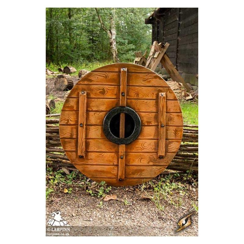 Epic Armoury’s Huginn & Muninn Iarla Shield is a 70 cm round latex shield befitting a god of wisdom and victory. You are a master of strategy and your knowledge knows no bounds, thanks in great part to the informants you keep. Inspired by early Vikings and Saxons, this Live Action Role Play (LARP) safe shield is carved from EVA foam to look like true wood. Coated in a layer of durable latex, it features a wood grain texture on both the front and back--something that makes this shield truly unique and perfect for a truly immersive look. You can even find small sculpted nails hammered into the braces, because attention to detail is so important.