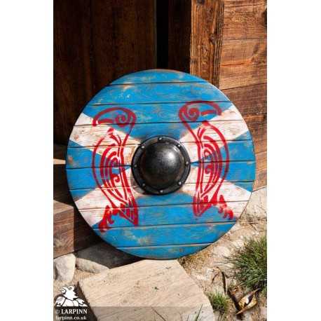 This shield has been hand painted blue, with an outlined white cross mark through its center. Two red Norse-inspired ravens--Huginn and Muninn--decorate its face. Its slight convex shape and the metallic-painted boss on the front provides an edge in combat, and its reliable punch-grip fits comfortably in your hand thanks to its suede wrap and shape. Keep your shield in great condition with regular latex maintenance.