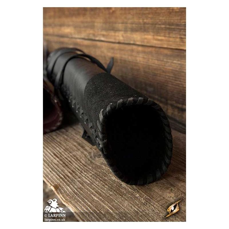 At the top, it is fitted with a patch of soft split-leather, protecting the safety of your arrows and providing additional grip. The quiver comes with a long leather belt with a brass-plated iron buckle, allowing it to be worn over the shoulder.