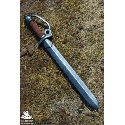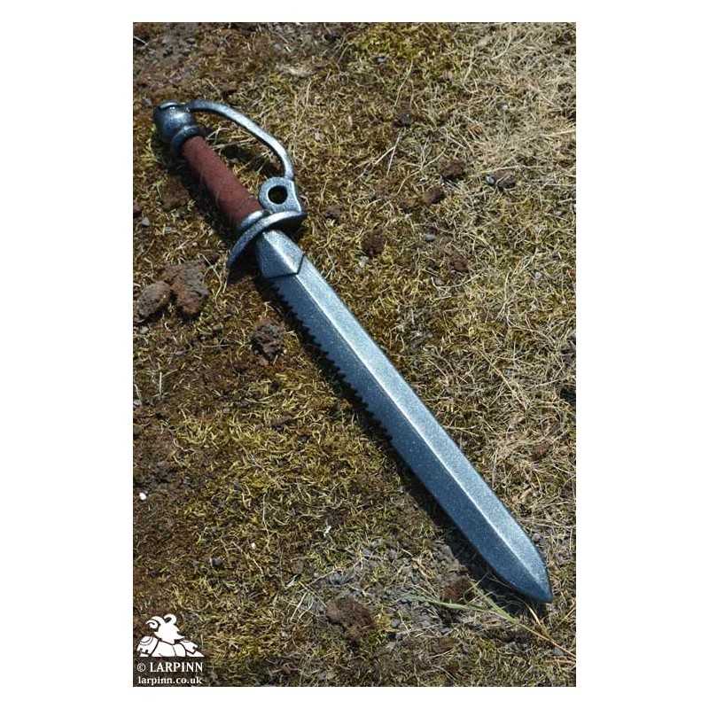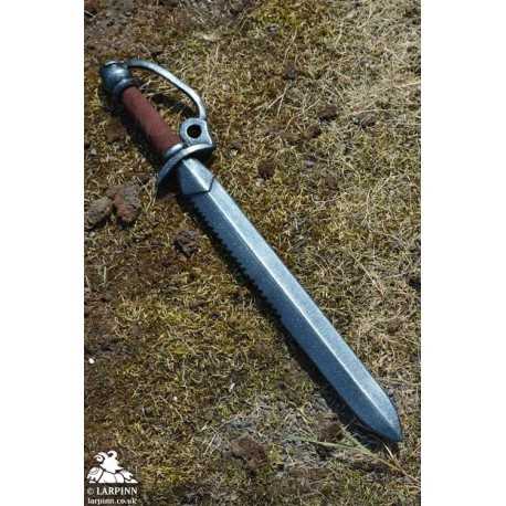 Epic Armoury’s Hunting Sword is a latex shortsword designed to serve as both a weapon and a tool. The 38 cm double-edged blade has a centre ridge, and features a saw tooth edge ideal for cutting wood or bone. The crossguard is short, connecting to the pommel with a handguard that protects the 11 cm ergonomic handle wrapped in split-leather.