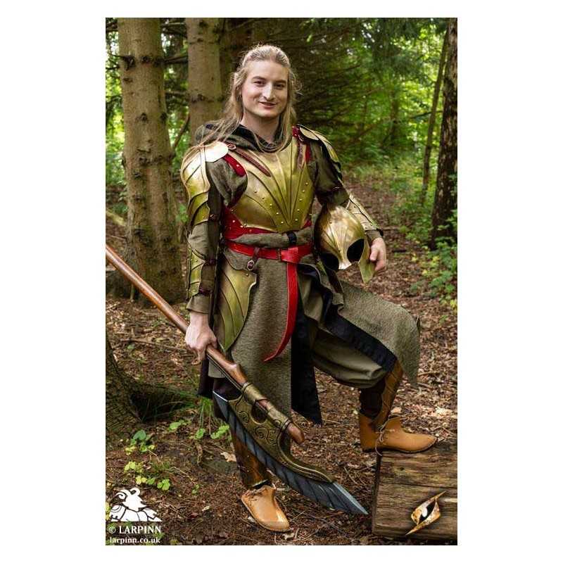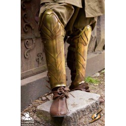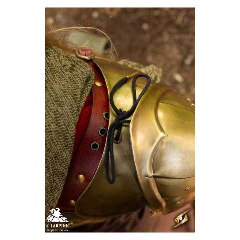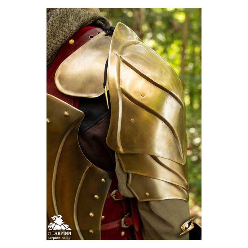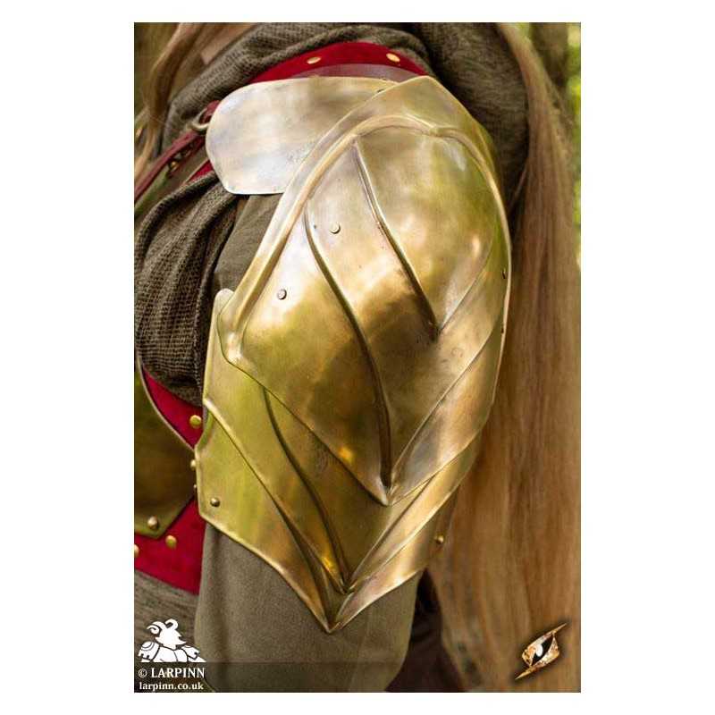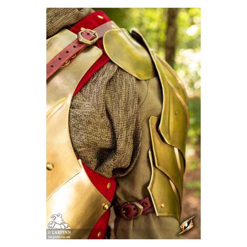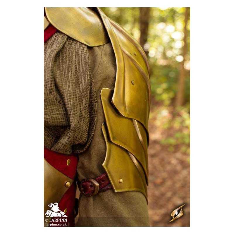 This high-fantasy armour is secured by tightening the leather straps around your arms. Made of 1 mm thick mild steel and top-grain leather straps and fittings, this armour piece is finished with a brass coating that gives it a particularly regal appearance. With regular leather and metal armour care, it will last for many seasons.