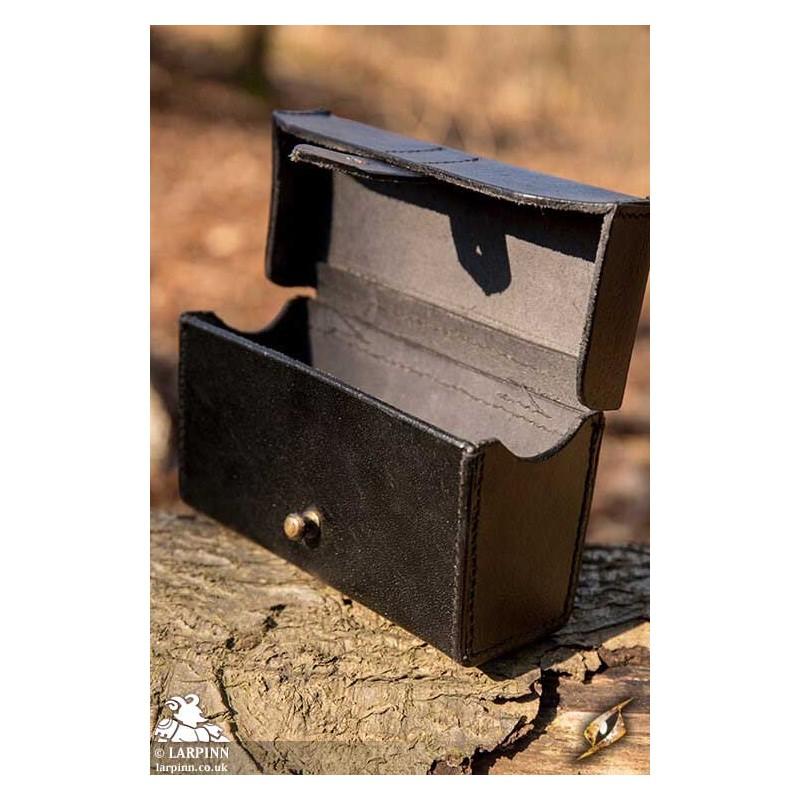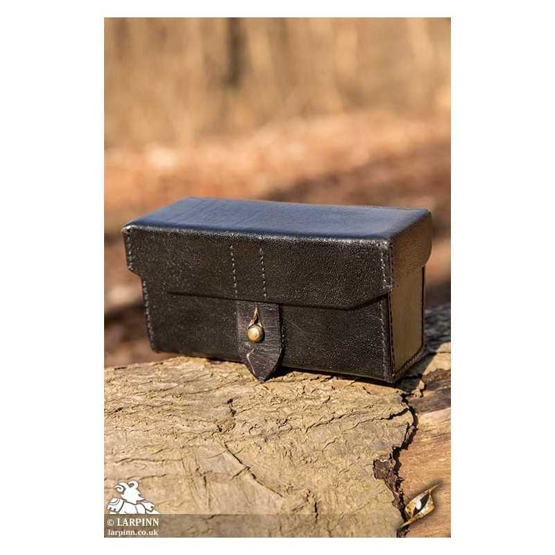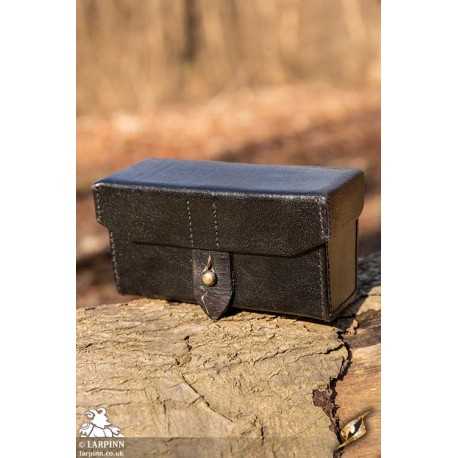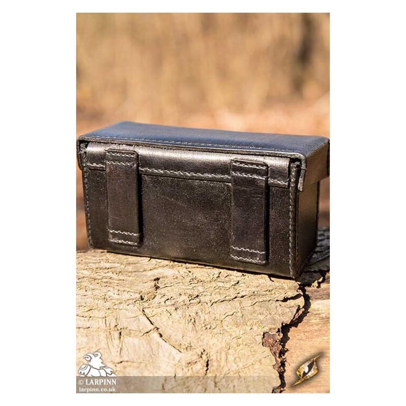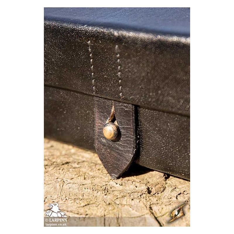 The Imperial Leather Bag is a rigid leather box intended to hang from the belt. The lid is deep and overlaps the bottom in order to keep the contents safely inside. It is locked by pushing a brass knob through the front leather strap, and is attached to the belt using the two leather straps on the back. There is also a square ring on the back which can be utilized to attach the Imperial Leather Bag to other packs.