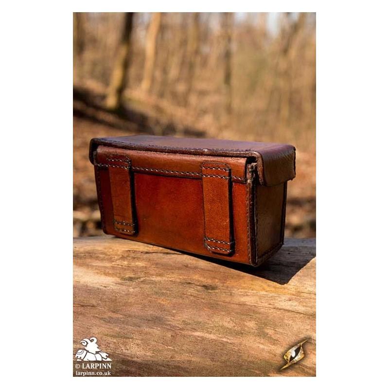 The Imperial Leather Bag is a rigid leather box intended to hang from the belt. The lid is deep and overlaps the bottom in order to keep the contents safely inside. It is locked by pushing a brass knob through the front leather strap, and is attached to the belt using the two leather straps on the back. There is also a square ring on the back which can be utilized to attach the Imperial Leather Bag to other packs.