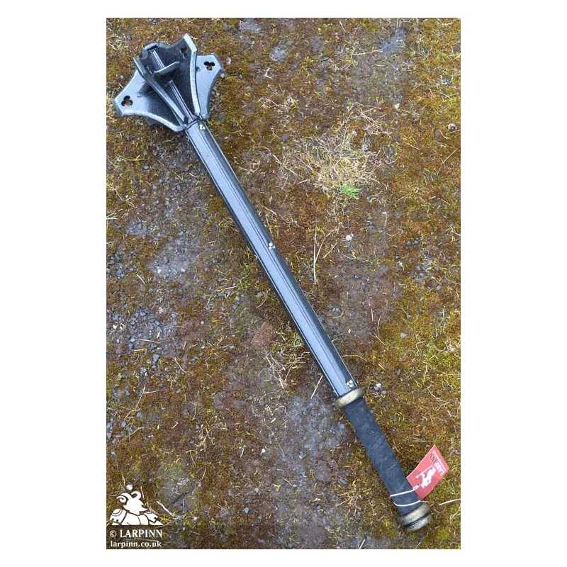 Epic Armoury’s Imperial Mace is an 85 cm long latex mace inspired by 12th century knights, and designed to match the Imperial Shield. The mace has six detailed and reinforced flanges, each featuring a three leaf clover. The clover or club motif continues down the 50 cm staff, carved into the handpainted wood grain. An 18 cm handle at the end of the staff is wrapped in black split-leather to provide a comfortable grip.