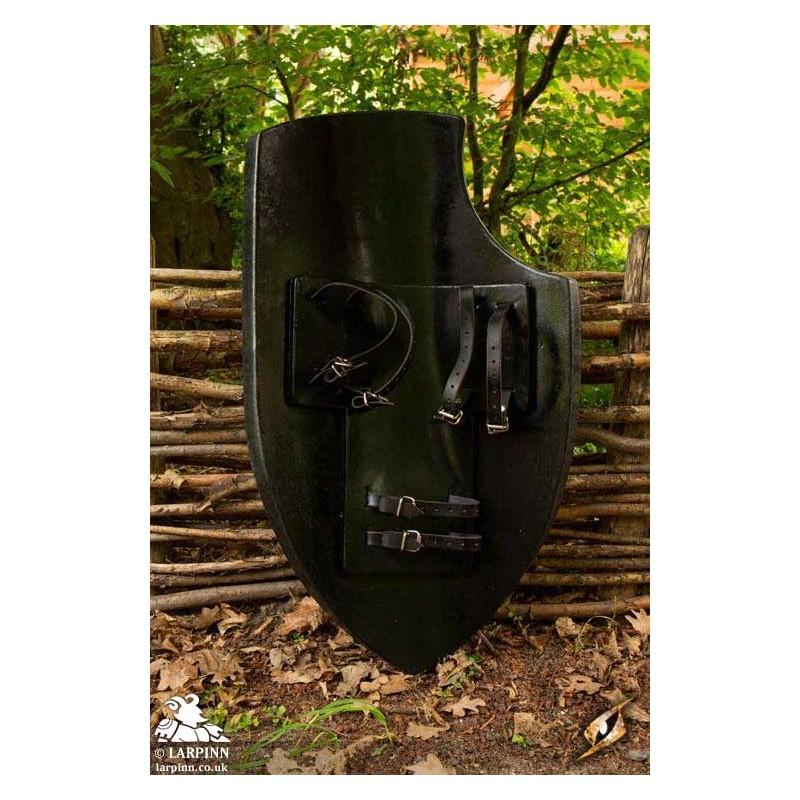Wear this Knight Shield left-handed with the use of three leather arm straps on the back, secured through hard EVA foam for a reliable and solid grip made to last. Feel confident that this latex shield will withstand the continued abuse of a LARP with regular latex maintenance.