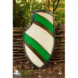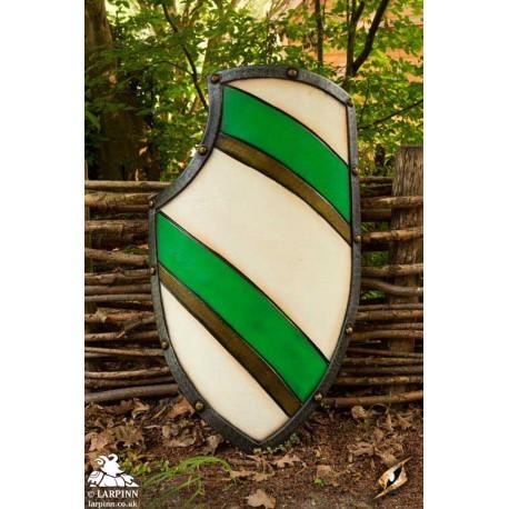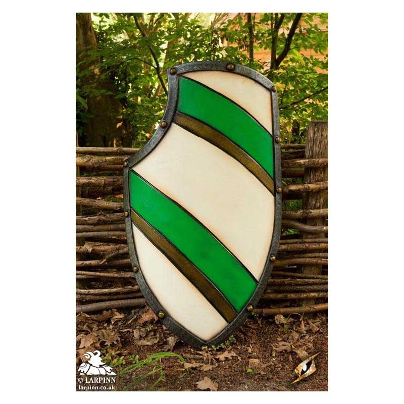 Epic Armoury’s Knight Shield is a large shield inspired by heater shields used for jousting in the 15th century. A hand painted green, white and gold striped face mimics a traditional heraldry design. The rim is detailed to look like metal with brass studs. While the design is simple, this Knight Shield is timeless and classic.