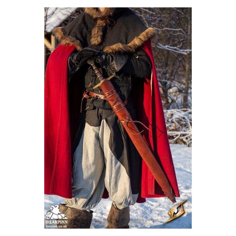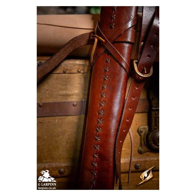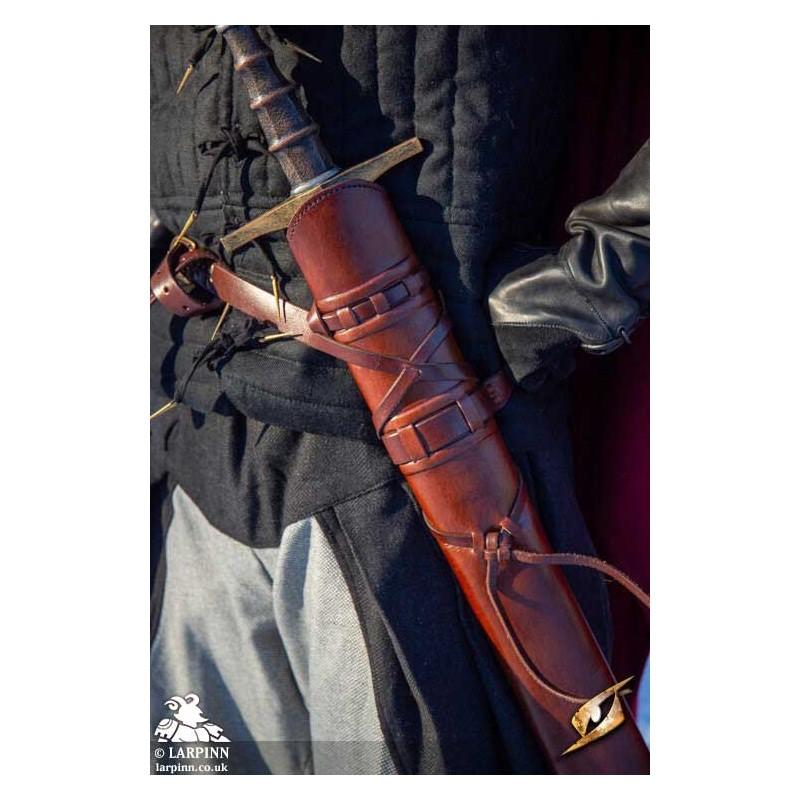 Epic Armoury’s Knights Scabbard is a long leather sheath designed to guard your weapon from the elements while carrying it in style! This all-in-one full-blade sheath has an integrated belt and soft polyester-wool padding to protect your weapon while making it easy to draw. The Knights Scabbard is designed to fit the swords of the Stronghold Master Collection, with the measurement of the ricasso being the length difference in both scabbards and swords. While designed to fit the Stronghold Collection, the Knight Scabbard can easily fit other Epic Armoury swords, depending on length.