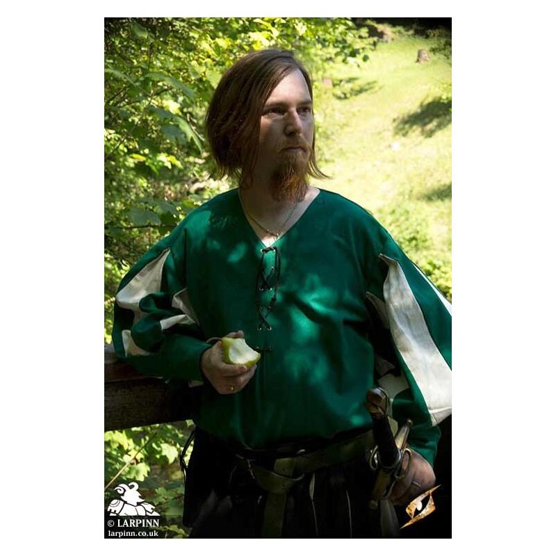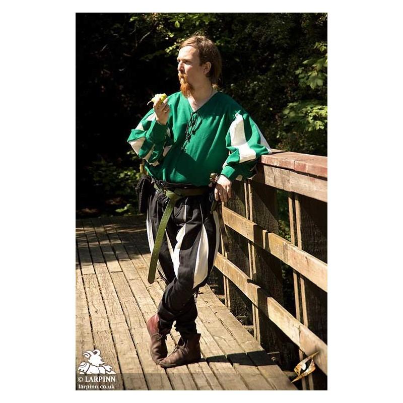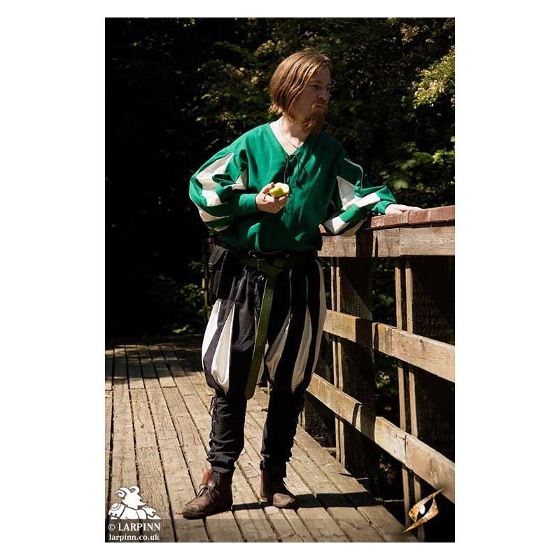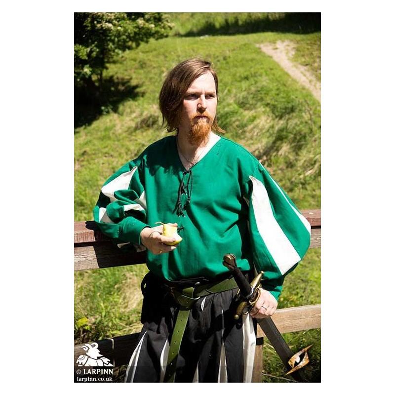 Epic Armoury’s Landsknecht Shirt is a hip-length shirt with baggy sleeves and vertically cut colours, most often associated with the wealthy men of the Renaissance. Made from durable heavy cotton, this shirt has a broad neck which can be laced open or closed. The contrasting puff-and-slash sleeves end in narrow cuffs at the wrists, which are adjusted by tightening its reinforced cotton cord to get the best fit.