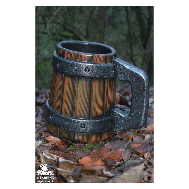 The LARP Beer Mug with Metal Bands is a throwing weapon handy for impromptu fights against other midnight boozers. The beer mug is cylindrical, standing 20 cm tall with a 18 cm diameter. The mug is carved with a wood texture and coloured brown to resemble the staves of a cask, rimmed with riveted metal-hoops. The hoops connect to the metal-coloured handle which is 8 cm deep, leaving plenty of room for grip. The inside is coloured black, mimicking a dark wax typically found on the inside of wooden mugs.