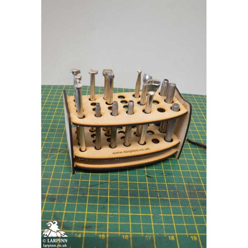 This pack contains a single 'Larp Inn - Leather Stamp and Punch Rack'. The rack is cut and etched in MDF. There are spaces for 21 items in this rack of varying sizes. If you have a specific requirement for your hole sizes, let us know and