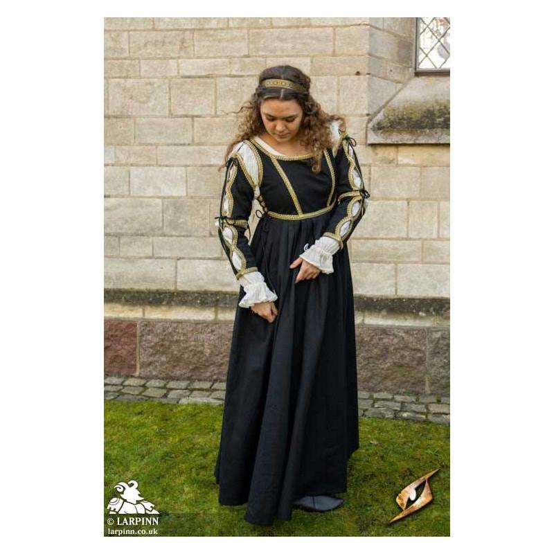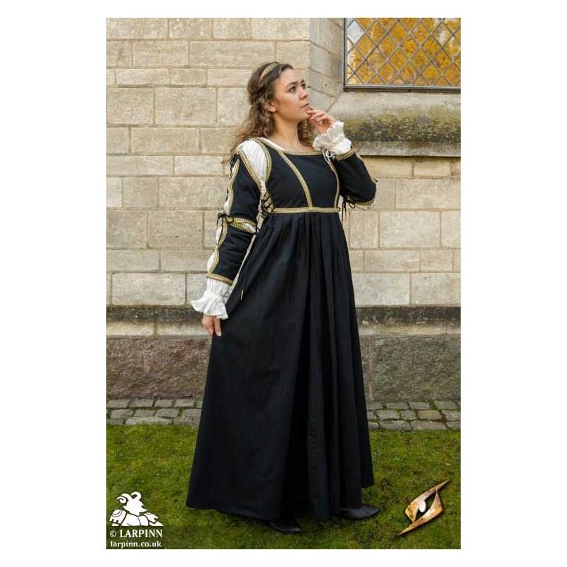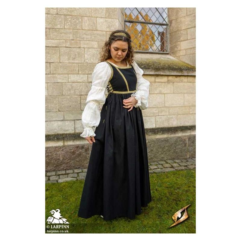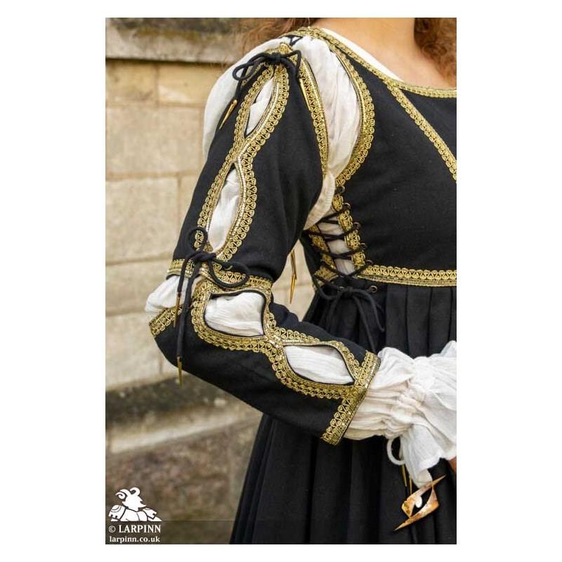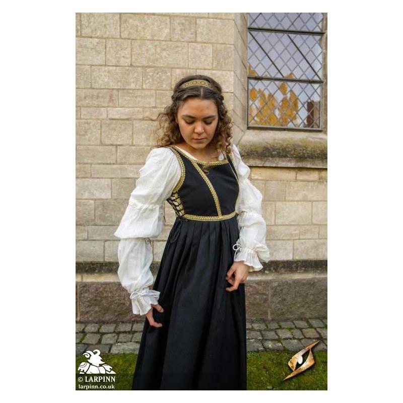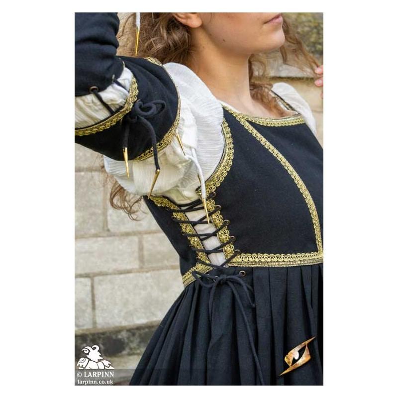 Dress Lucrezia is the perfect dress for any adventurer that wishes to arrive feminine and fancy to the great hall. The dress is inspired by the Renaissance with golden trimmings to emphasise a lucrative lifestyle. The arms can be detached entirely or attached to reveal your choice of undergarments boldly. Allow us to recommend the matching Shift Lucrezia!