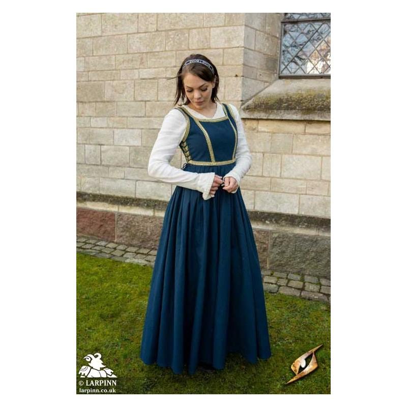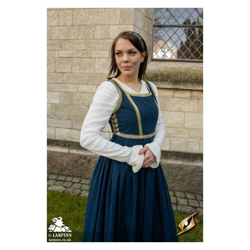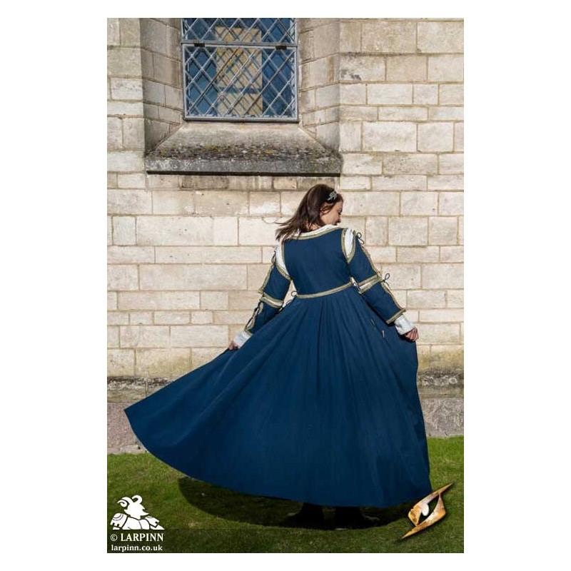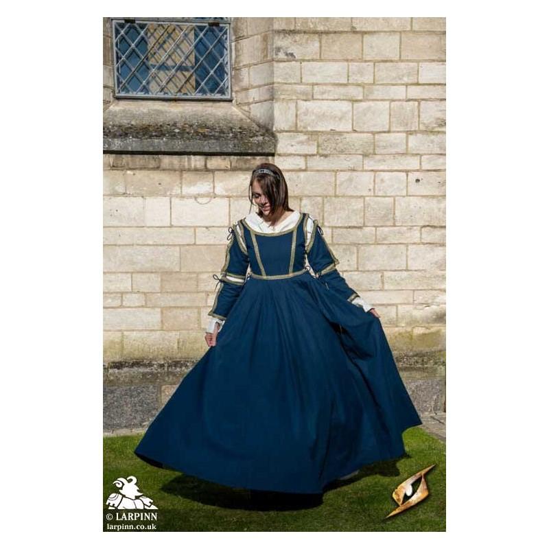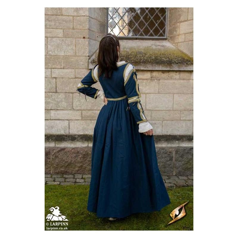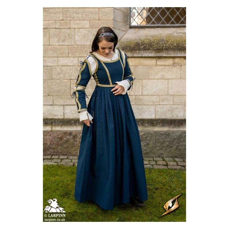 Dress Lucrezia is the perfect dress for any adventurer that wishes to arrive feminine and fancy to the great hall. The dress is inspired by the Renaissance with golden trimmings to emphasise a lucrative lifestyle. The arms can be detached entirely or attached to reveal your choice of undergarments boldly. Allow us to recommend the matching Shift Lucrezia!