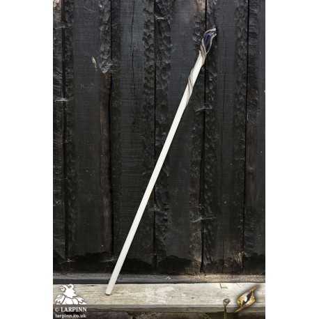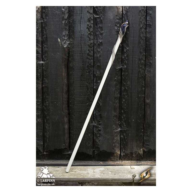 The Mage Staff is a 190 cm latex staff designed to be the perfect choice for spell-casters. It has a light and natural feel with a magical aura surrounding the handpainted and sculpted blue crystal at the top. Detailed wooden vines attach the crystal to the staff, which spiral downward in an elegant style. The staff itself is a creamy white colour with fine wooden textures.