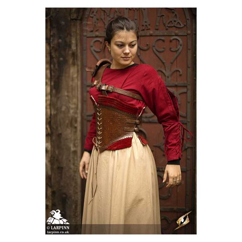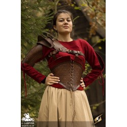 Epic Armoury’s Epic Black Margot Corset is a leather underbust designed to protect the abdomen while making you look and feel confident on the battlefield. The corset’s fit is changeable by tightening the leather cord down the front and back and adjusting the two leather straps along the sides. The leather bodice is embellished with detailed imprinting and edged with attractive fabric to increase comfort and appeal. With regular leather care, you can expect the Margot Corset to last a long time. Use this corset to create an intimidating statement or add some interest to your kit.