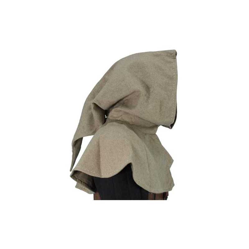 Epic Armoury’s Medieval Hood is a hood with a mantle and long hood tail. The mantle covers the shoulders, keeping the upper chest warm while the hood protects the head and face from harsh wind. Made from felted, blended wool and lined on the inside with soft cotton, this hood is comfortable and solid. Decorative stitches line the hood and hem, embellishing and adding great detail to a practical product.