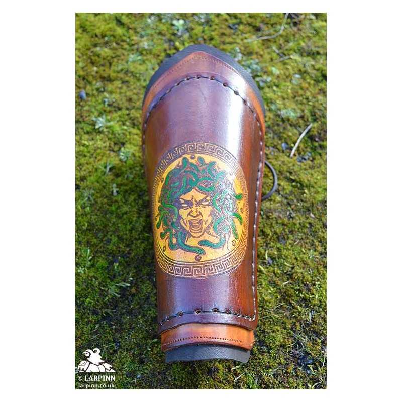 These hand painted bracers are made at Larp Inn, in the UK. These bracers are etched and hand dyed by us, providing beautiful quality and a unique finish on every pair. The thicker leather used on the top layer makes them perfect for 'Medium Armour Use' at most LARP Systems. However, the bracers work perfectly on their own. The calf suede finish on the inside is used for maximum comfort.