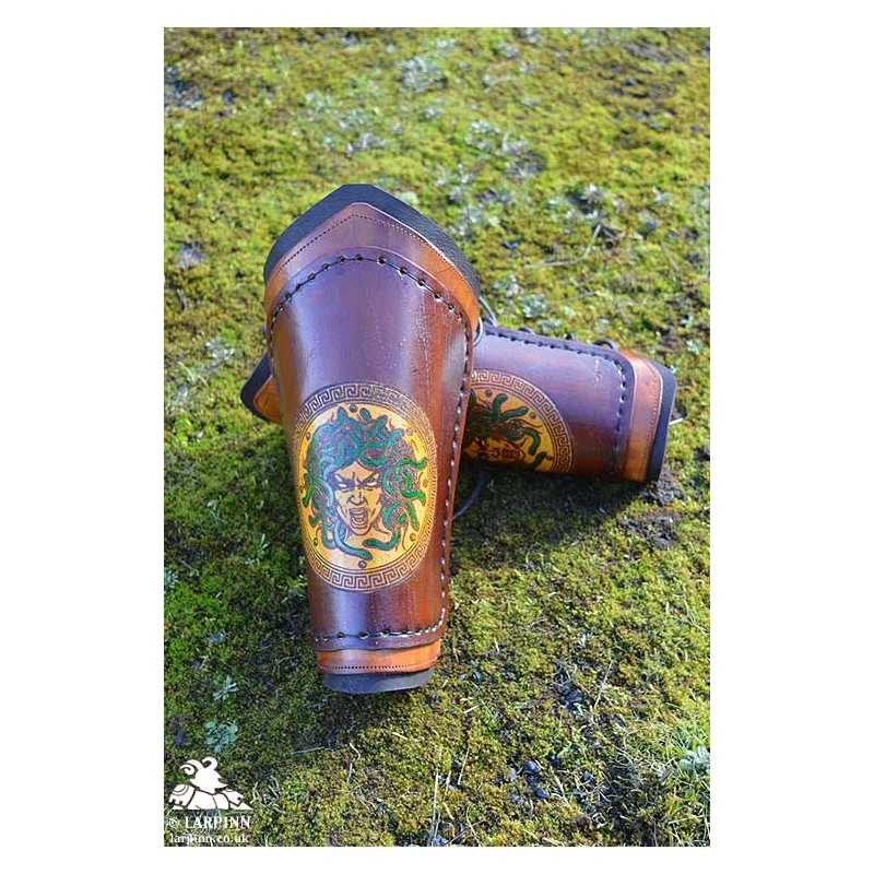 Double Layer With Lacing - The leather face is made from flexible veg tan leather embossed with a design, then hand painted, dyed and sealed.This flexible face plate is then sewn to a thicker, hand-dyed back plate. Finally, the bracers are then backed with a soft calf-suede lining which is sewn with a trim to increase comfort. The bracers are closed with leather thonging, for a tighter fit during wear.