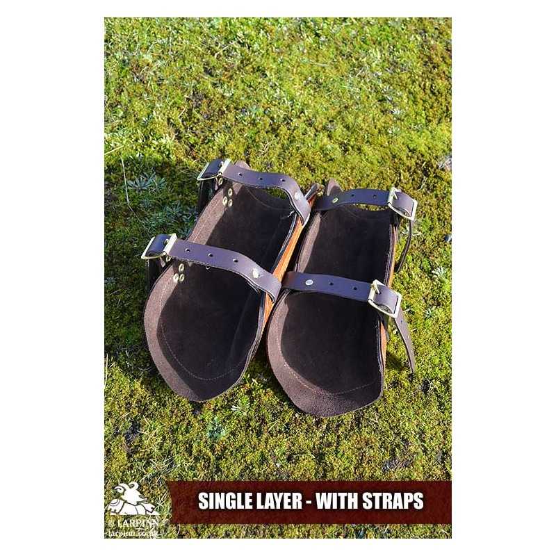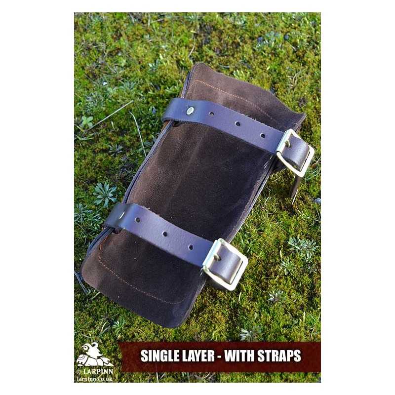Single Layer - The leather face is made from flexible veg tan leather embossed with a design, then hand painted, dyed and sealed. The bracers are then backed with a soft calf-suede lining which is sewn with a trim to increase comfort. The bracers are closed with a pair of straps and buckles.