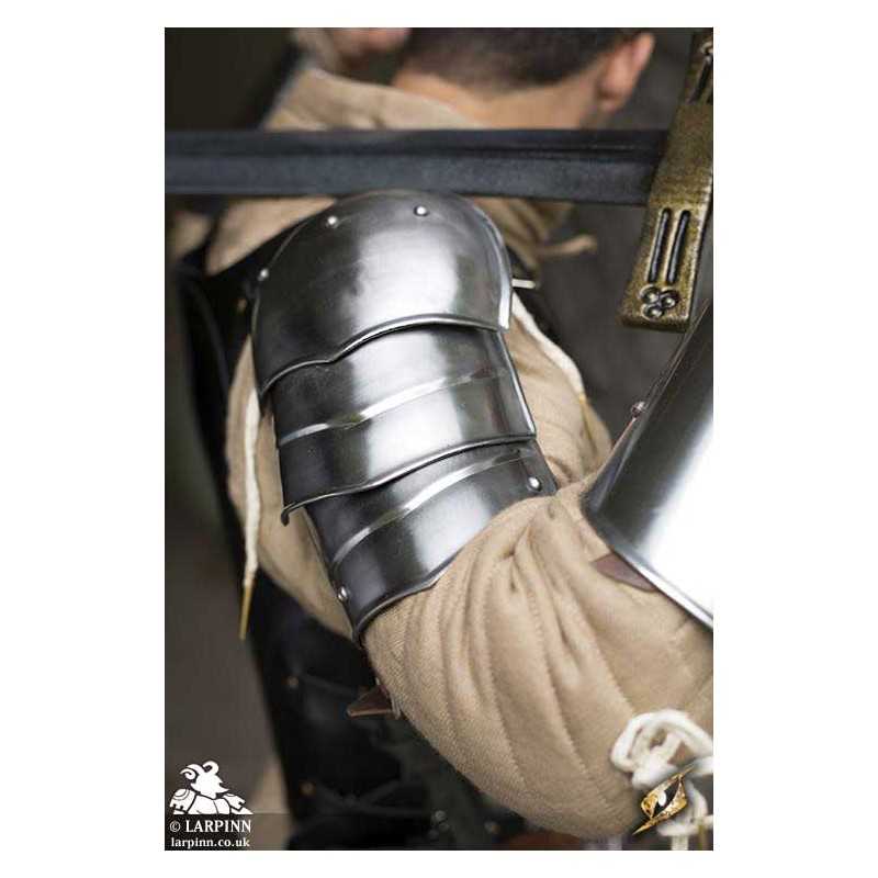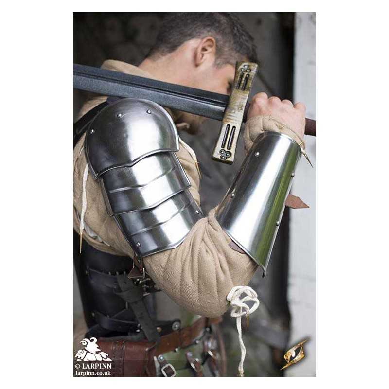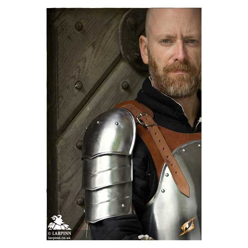 The Shoulder Plates are a set of two shoulder guards with spaulders. The spaulders have three ridged metal plates--or lames--overlaying one another to provide laminate protection of the upper arms. The shoulderplates are fastened with leather straps around the biceps and at the shoulder blade, attaching to a breastplate. Epic Armoury breast- and backplates can be purchased separately and have fittings for mounting the shoulders.