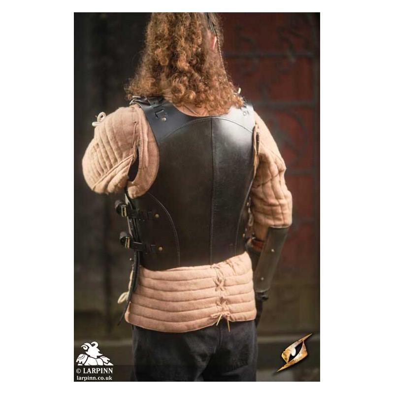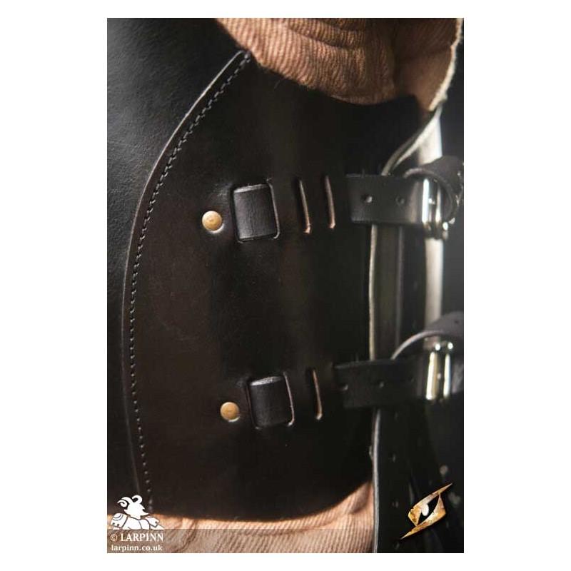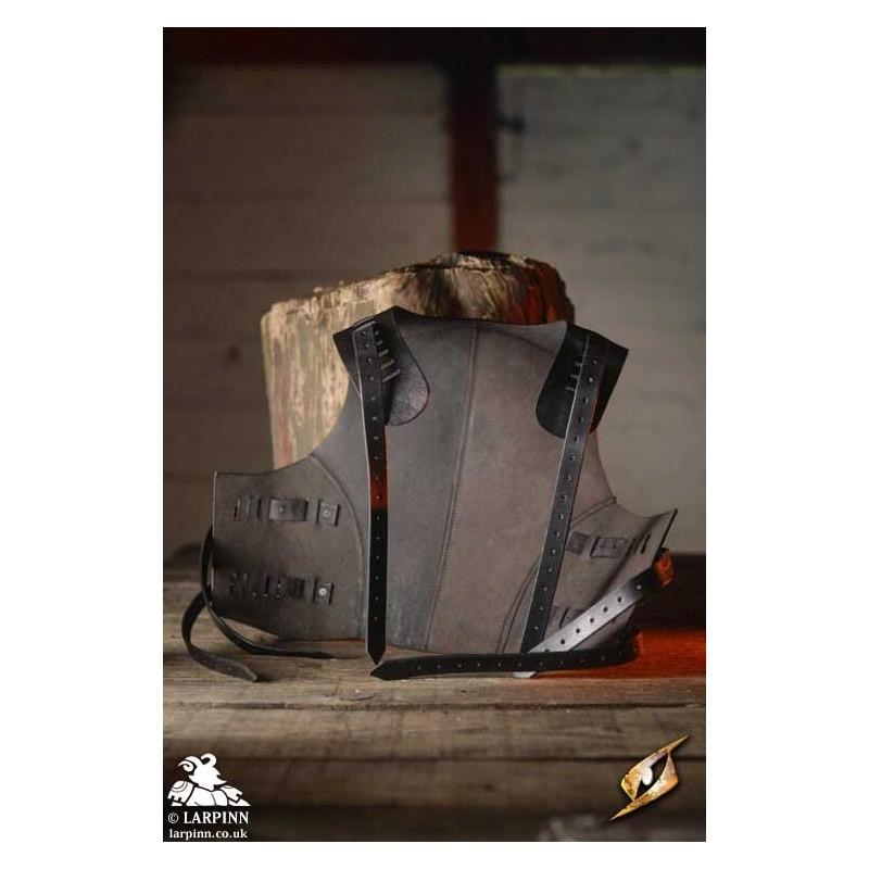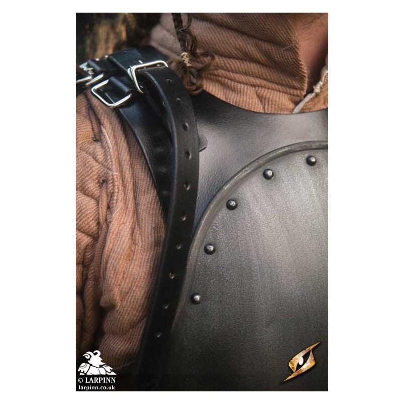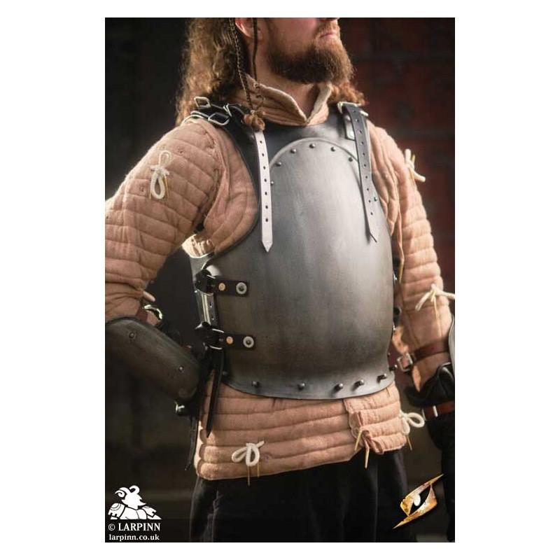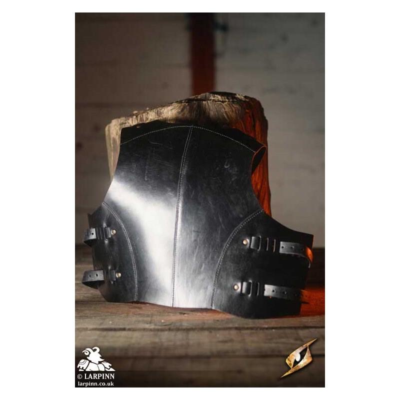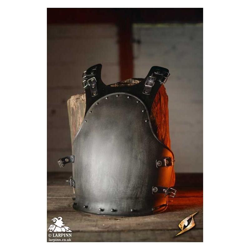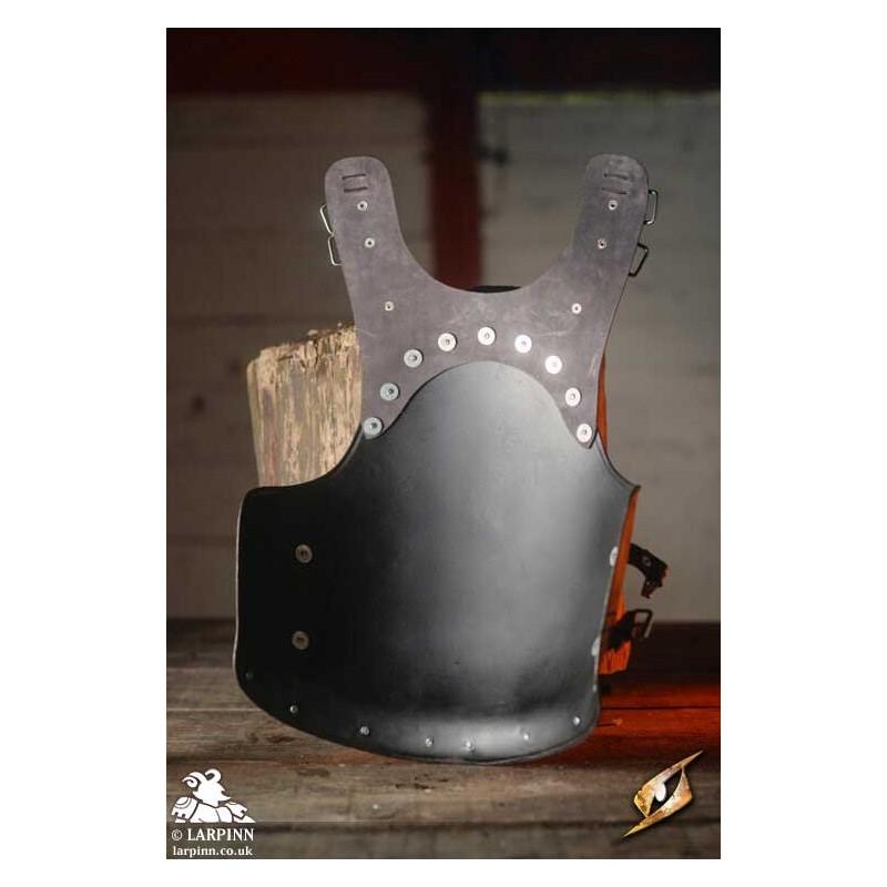 Epic Armoury’s Mercenary Torso Plate is a cuirass made from leather and steel covering the front and back of the wearer's torso. The front of this breastplate circles the wearer’s neck in an inverted U-shape, with the chest apex protecting the thorax before sloping around the ribcage to protect under the arms. The lower edge of the breast plate is slightly rounded, allowing it to fit around the crests of the hips and still cover the vulnerable pelvis. The steel plate is fitted on a black leather suit, which straps to the back leather plate at the shoulders and the sides.