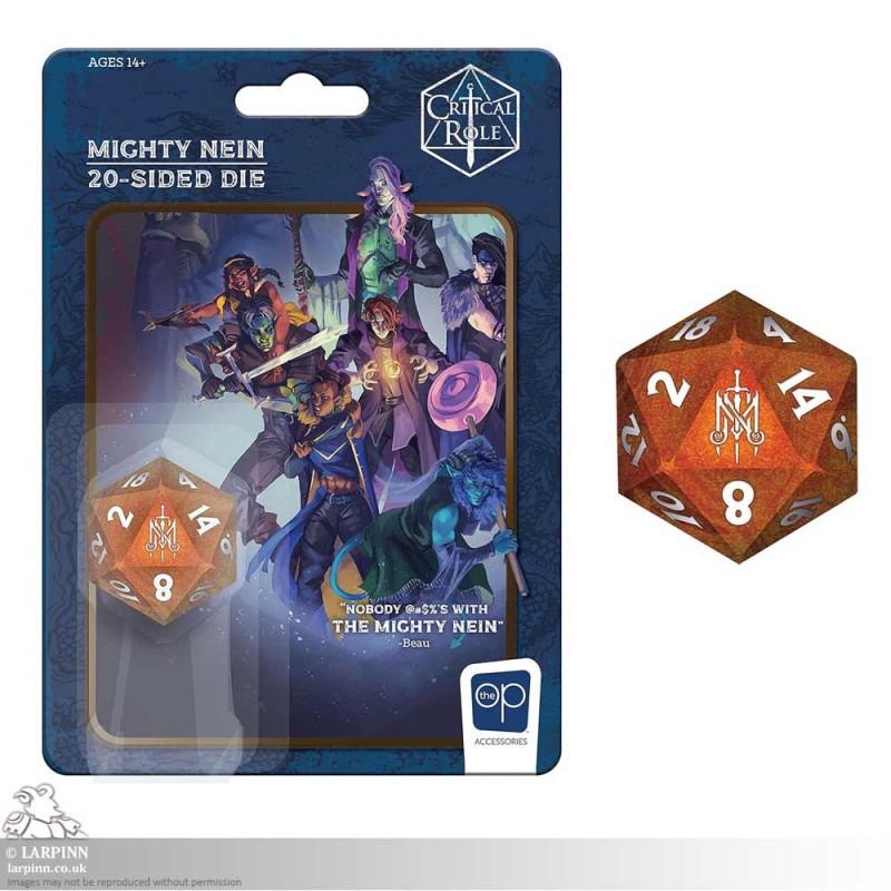 Collectible Critical Role 20-sided die featuring The Mighty Nein emblem in the 20 spot.