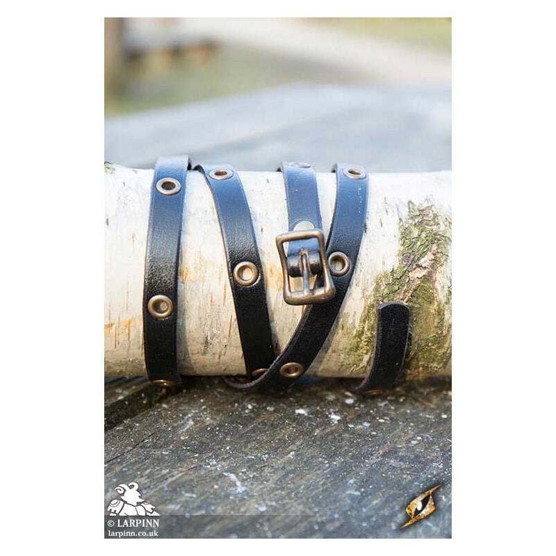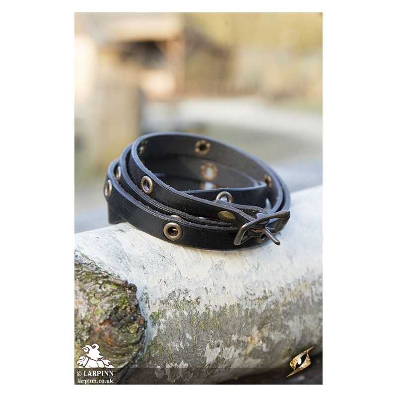 The Multi-strap Bracelet is a long, slim leather belt designed to be worn as a unique bracelet at the wrist. Made from a 125 cm long and 1.25 cm wide top-grain leather strap and brass eyelets, it’s the perfect way to add detail and layering to a variety of costumes. Secure the bracelet by wrapping it around your wrist and closing it with a small brass buckle.