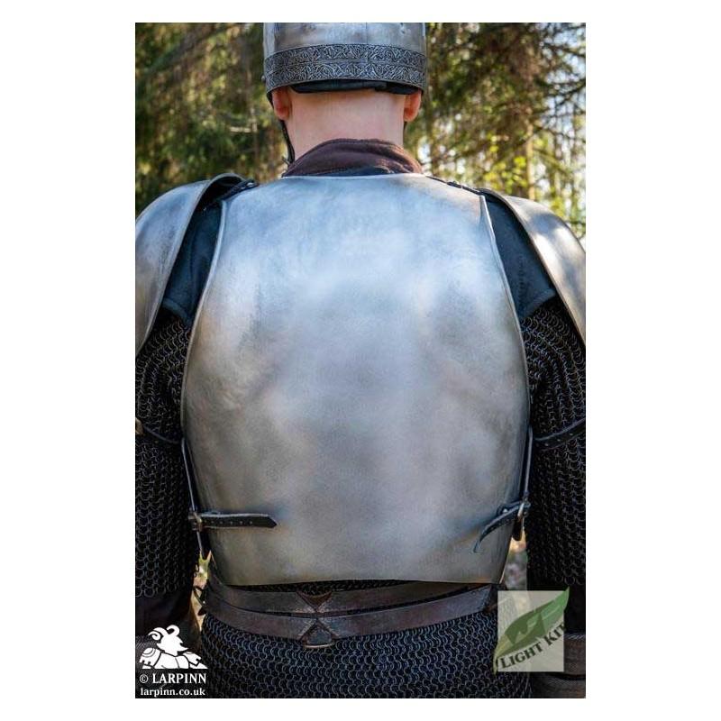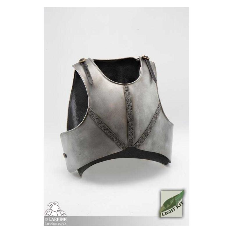 To the untrained eye, these polyurethane armours are difficult to distinguish from their metallic counterparts.They are, however, more comfortable to wear and can be worn for long periods of time without discomfort. Indeed, the flexible nature of this armour means that it can bend to the contours of your body in a way that rigid steel will not. Each part is a quarter of the weight of their steel equivalent, allowing for faster movement with less fatigue. Each piece is hand painted with a durable acrylic finish and is detailed to look as realistic as possible. The maintenance free finish will not rust like steel, and can be worn in all kinds of weather. Adjustable leather straps and the flexible nature of the armour allows it to be comfortably worn. The Nordic Light Kit Cuirass is inspired by Viking armour and features front- and backplate with a beautiful Celtic-inspired ornamenting.
