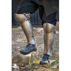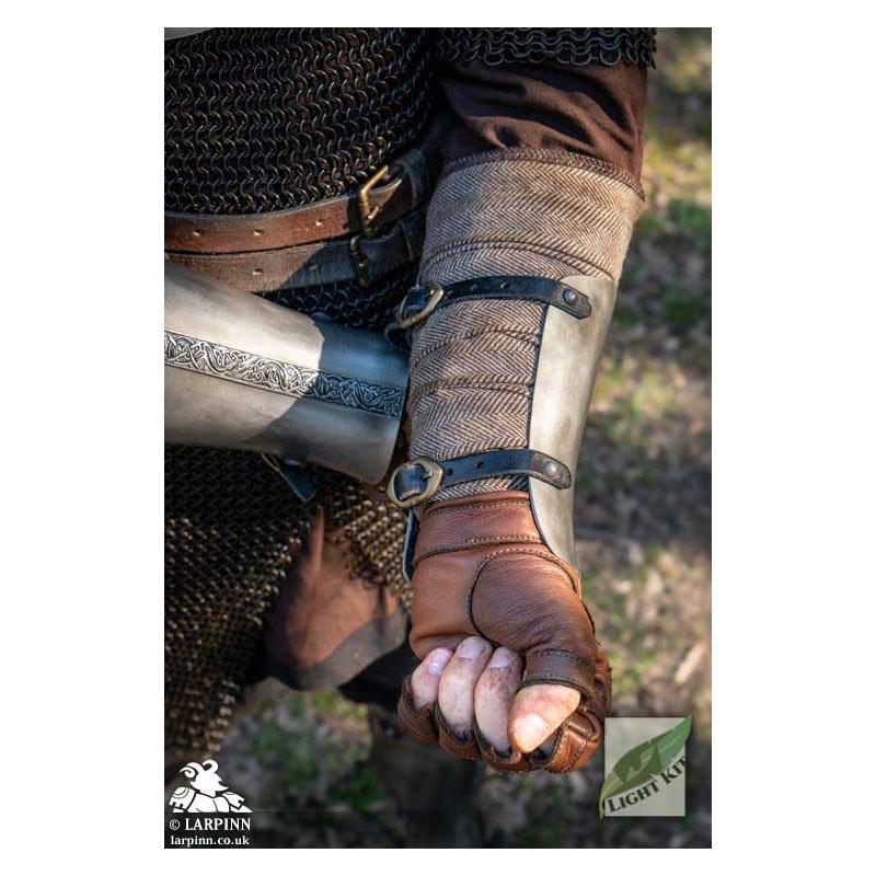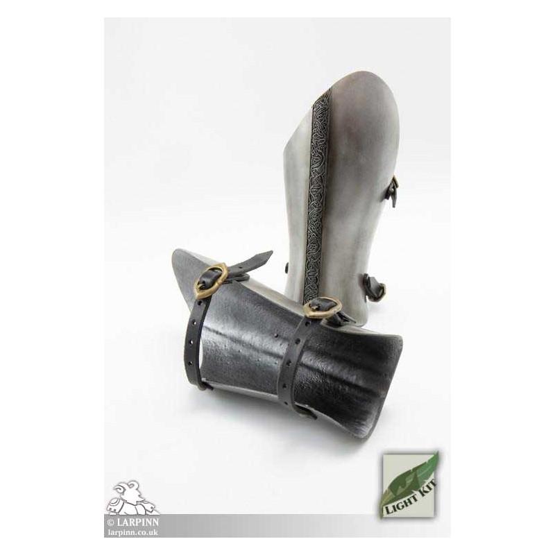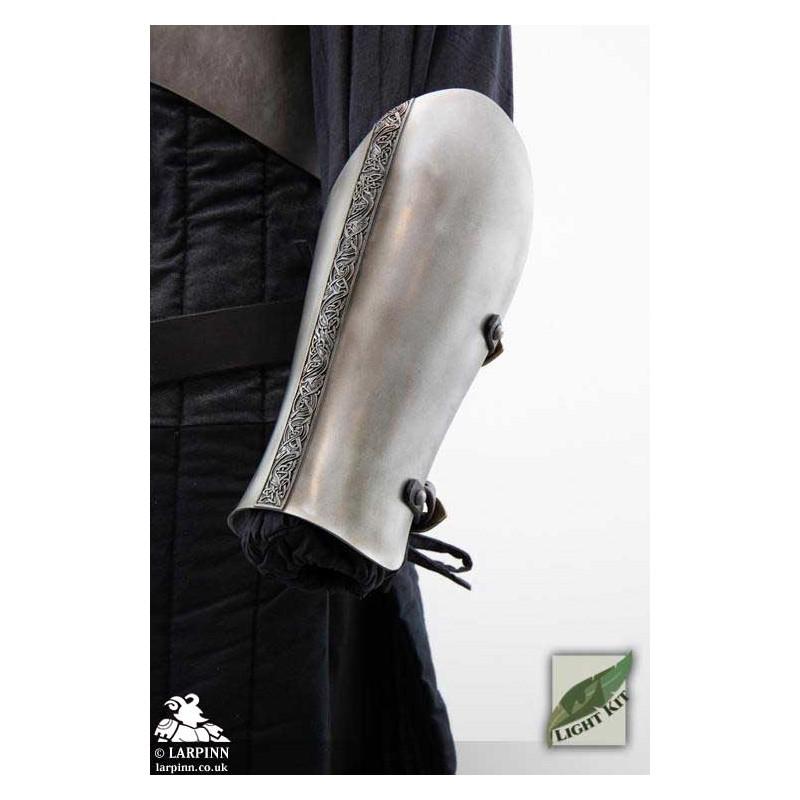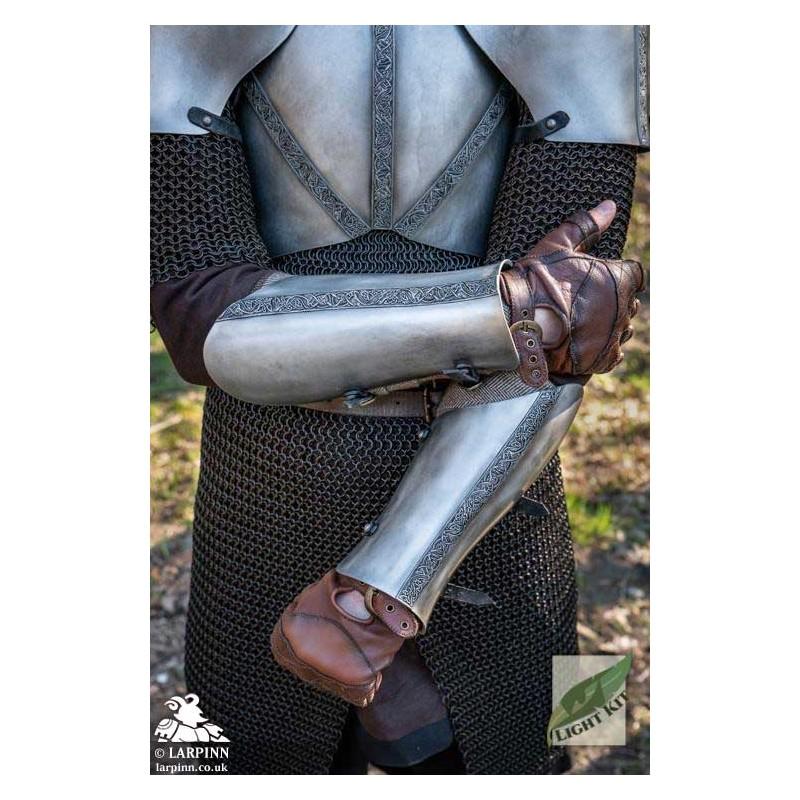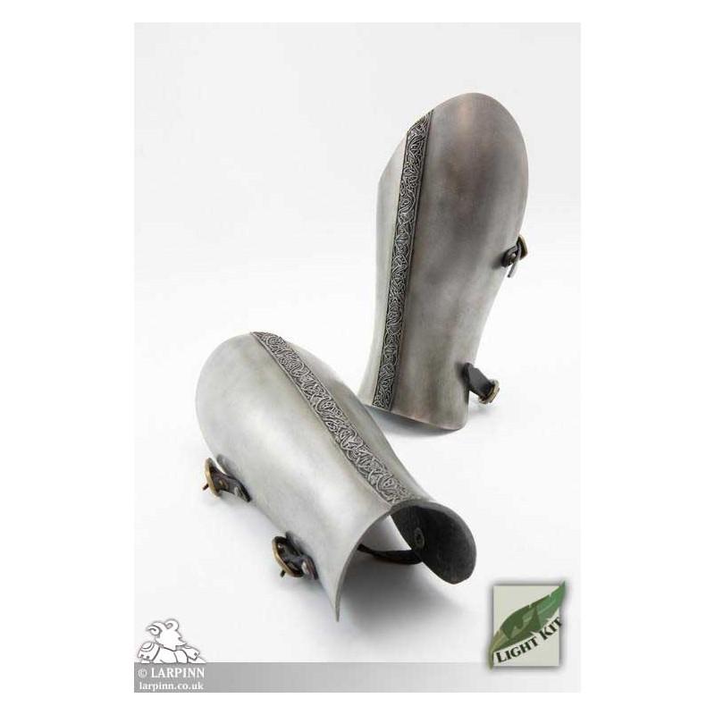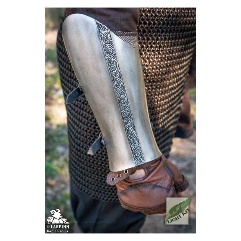 To the untrained eye, these polyurethane armours are difficult to distinguish from their metallic counterparts.They are, however, more comfortable to wear and can be worn for long periods of time without discomfort. Indeed, the flexible nature of this armour means that it can bend to the contours of your body in a way that rigid steel will not. Each part is a quarter of the weight of their steel equivalent, allowing for faster movement with less fatigue. Each piece is hand painted with a durable acrylic finish and is detailed to look as realistic as possible. The maintenance free finish will not rust like steel, and can be worn in all kinds of weather. Adjustable leather straps and the flexible nature of the armour allows it to be comfortably worn. These Nordic Light Kit Bracers are inspired by Viking armour and features a beautiful Celtic-inspired ornamenting.