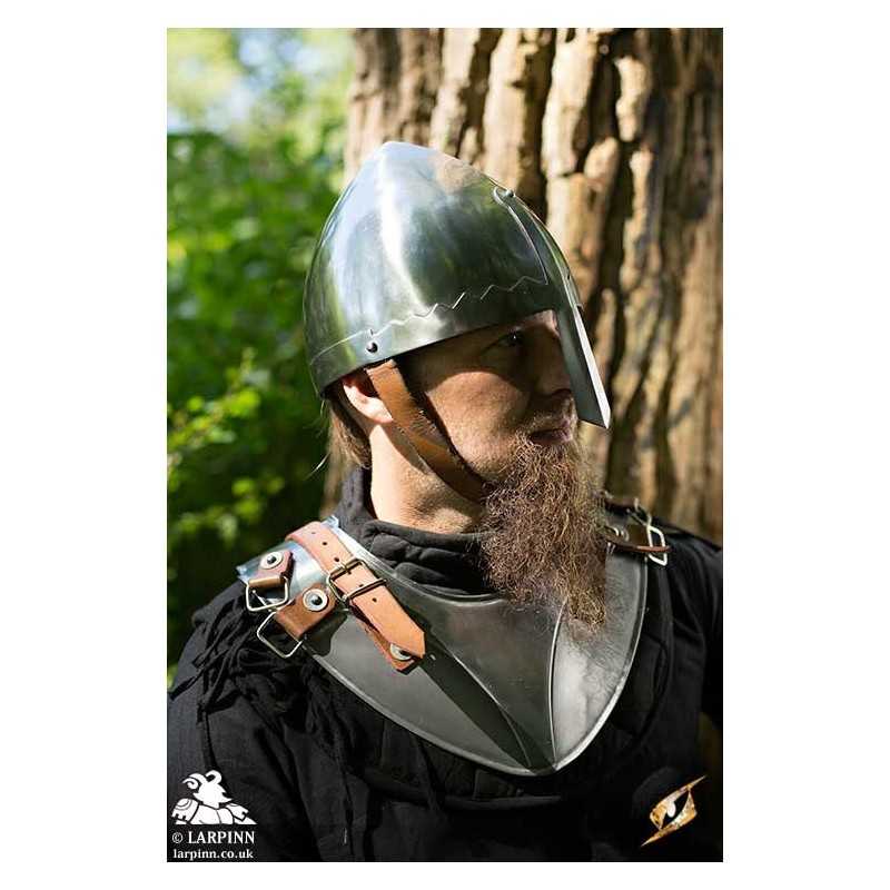 Secure the Norman Nasal Helmet by tightening the leather strap beneath the chin, keeping the helmet in place. Made of 1 mm thick mild steel and top-grain leather straps and fittings, this armour piece is built to withstand the abuse of a LARP or reenactment with regular leather and metal armour care.