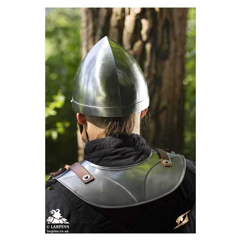 The Norman Nasal Helmet is a conical skull cap offering basic protection to the head and face. Inspired by the historical helmets worn during the majority of the middle ages, the Norman Nasal Helmet features a decorated nasal plate which runs from the forehead down over the bridge of the wearer’s nose. A ridge runs along the cap to give the helmet additional reinforcement while on the battlefield.