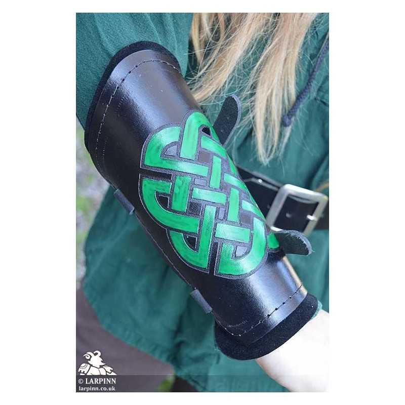 These bracers are made from two layers. The top layer is high-quality veg tan leather, embossed with the design and hand-dyed. The back plate is made from soft suede to add comfort. The supple leather molds to the wearer's arms over time, ensuring a personalized fit for maximum mobility.