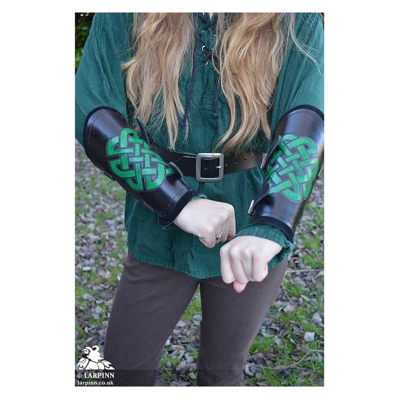 These hand painted bracers are made at Larp Inn, in the UK. These bracers are etched and hand dyed by us, providing beautiful quality and a unique finish on every pair. The thicker leather used on the top layer makes them perfect for 'Medium Armour Use' at most LARP Systems. However, the bracers work perfectly on their own. The calf suede finish on the inside is used for maximum comfort.