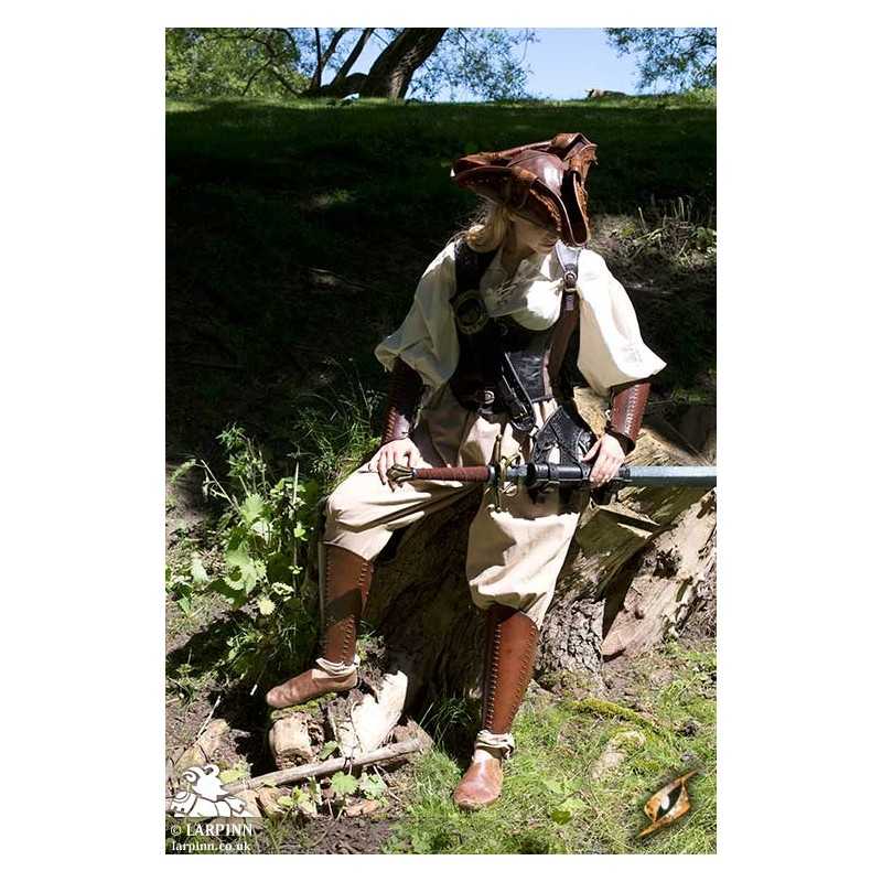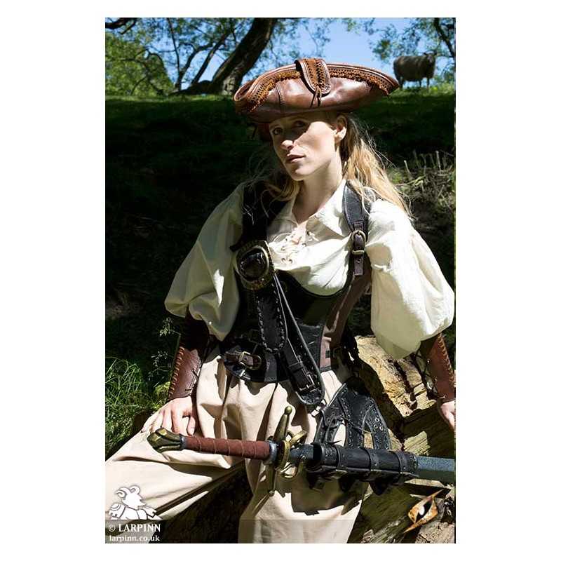 Epic Armoury’s “tricorne” Pirate Hat is handmade from natural full-grain quality leather and sturdy stitching, embellished with cotton canvas and laced leather around the brim. Inspired by popular 18th century hats of the time, its brim is turned up and pinned to form a triangle around the crown with leather lacing. With regular leather care, you can expect this hat to add a special touch to your kit for a long time!