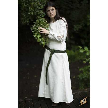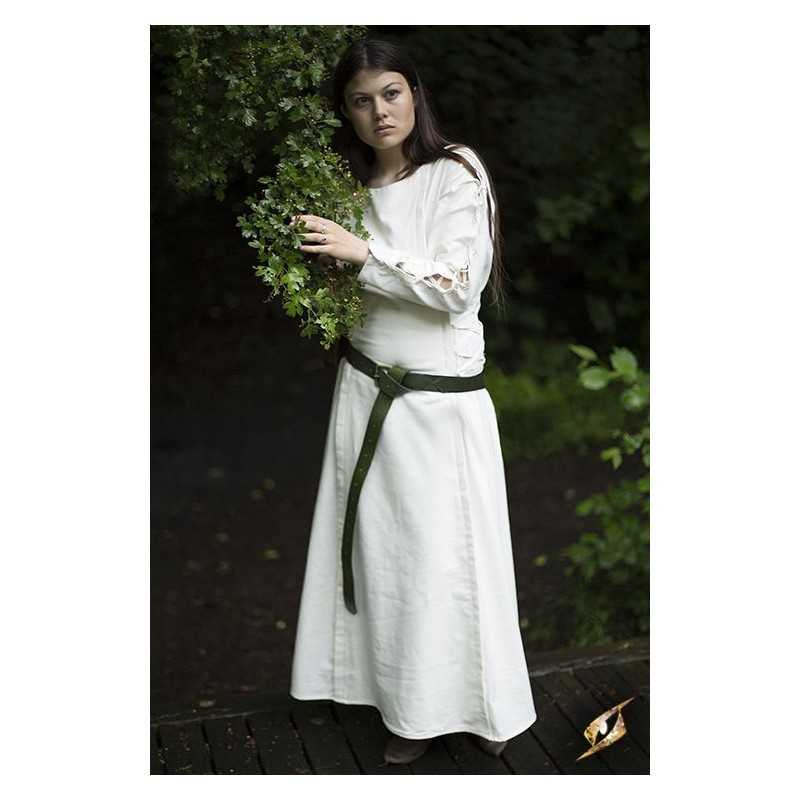 Epic Armoury’s Priestess Dress is a formal and elegant dress with long sleeves designed to function on its own or combined with other Epic Armoury clothes. Made from comfortable, soft cotton, this dress is tailored to be exceptionally versatile. The neckline is wide, showing off the collarbone and shoulders, complementing and balancing the rest of the dress’ design. Wear the long sleeves completely open in the summer, partially laced to show off your chemise, or tie them tight and straight from shoulder to wrist.