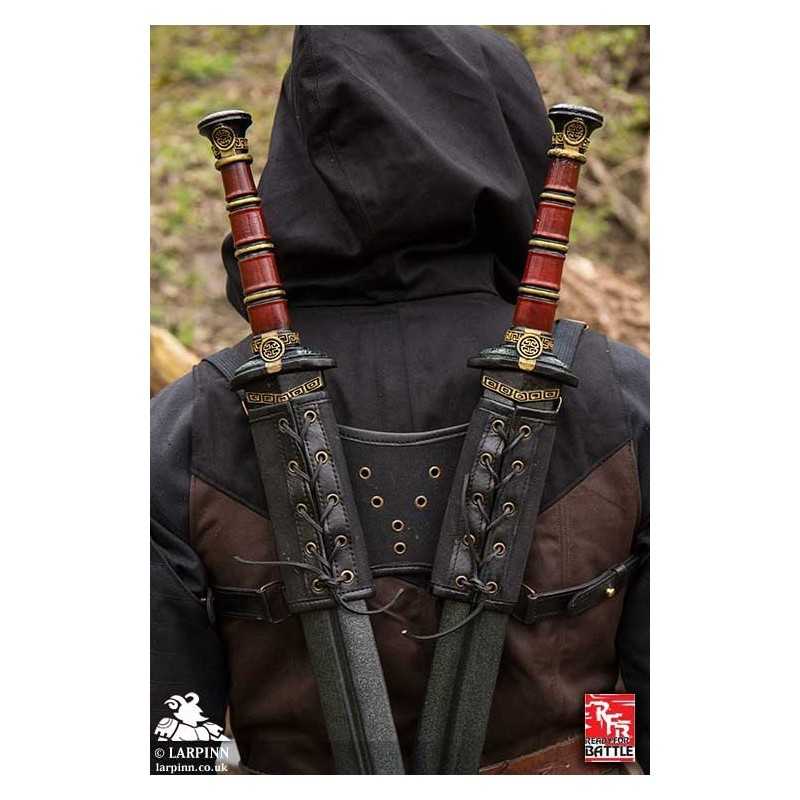 This bestselling Ready For Battle Double Harness is a weapon-frog designed to let you carry two weapons on your back. Durable and built to withstand the abuse of extensive use, the harness is made from stiff canvas and rimmed around all edges with stitched, double-layered leather. The harness can house two weapons set through frogs attached to a back plate. Each 16 cm long frog is open at both ends and usable by a wide variety of weapons. Simply adjust its flattened leather cords through its brass eyelet-reinforced braces on the front of each frog to fit the weapon you want to use. The Double Harness is worn on the back with cotton-weave straps around each shoulder.