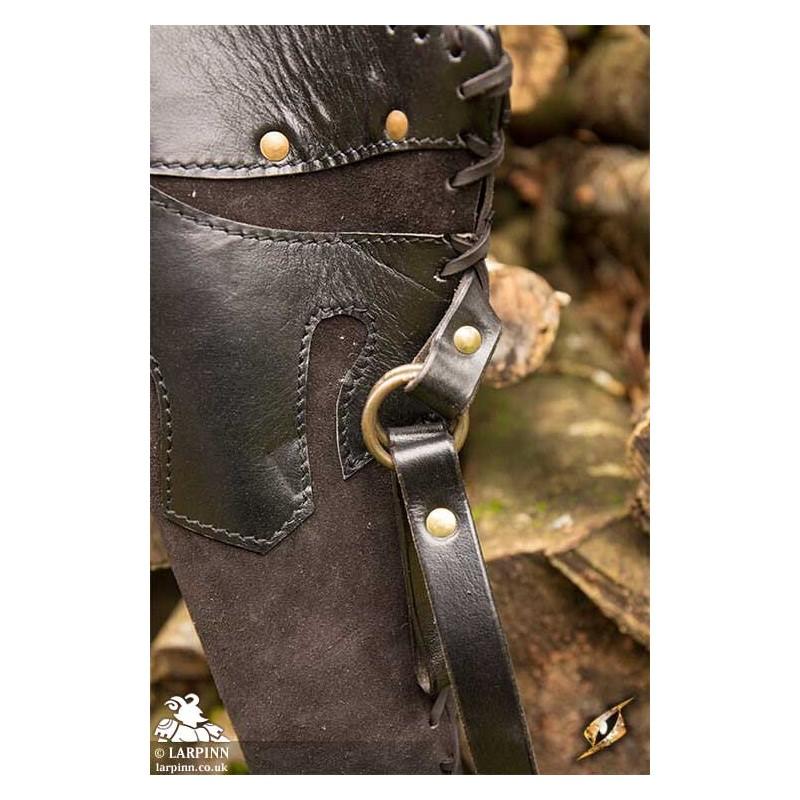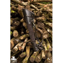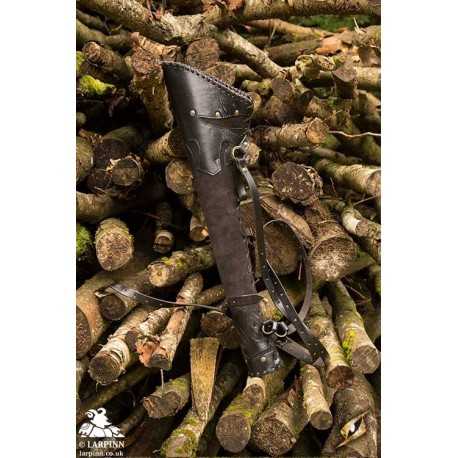 The Ranger Quiver is worn over the shoulder thanks to its 90 cm adjustable leather strap, brass-plated iron buckle, and 32 pre-punched holes. An additional 70 cm adjustable belt anchors the quiver around the waist, or to a baldric or pack. This quiver has a beautifully detailed style and colour and matches other Epic Armoury leather items, making it a good choice for an elf or noble archer with a fat purse.
