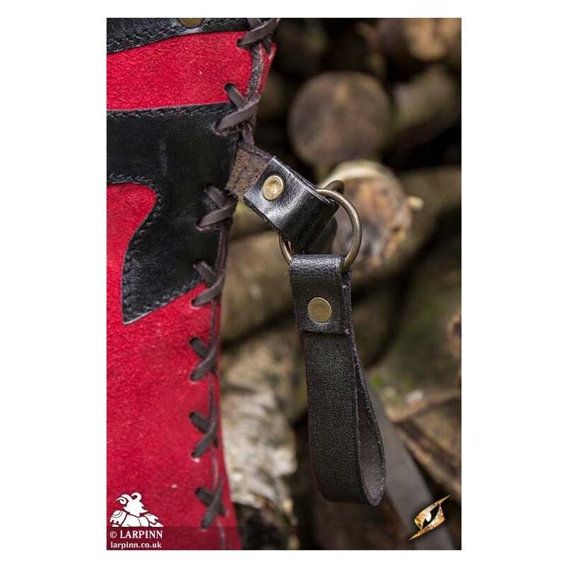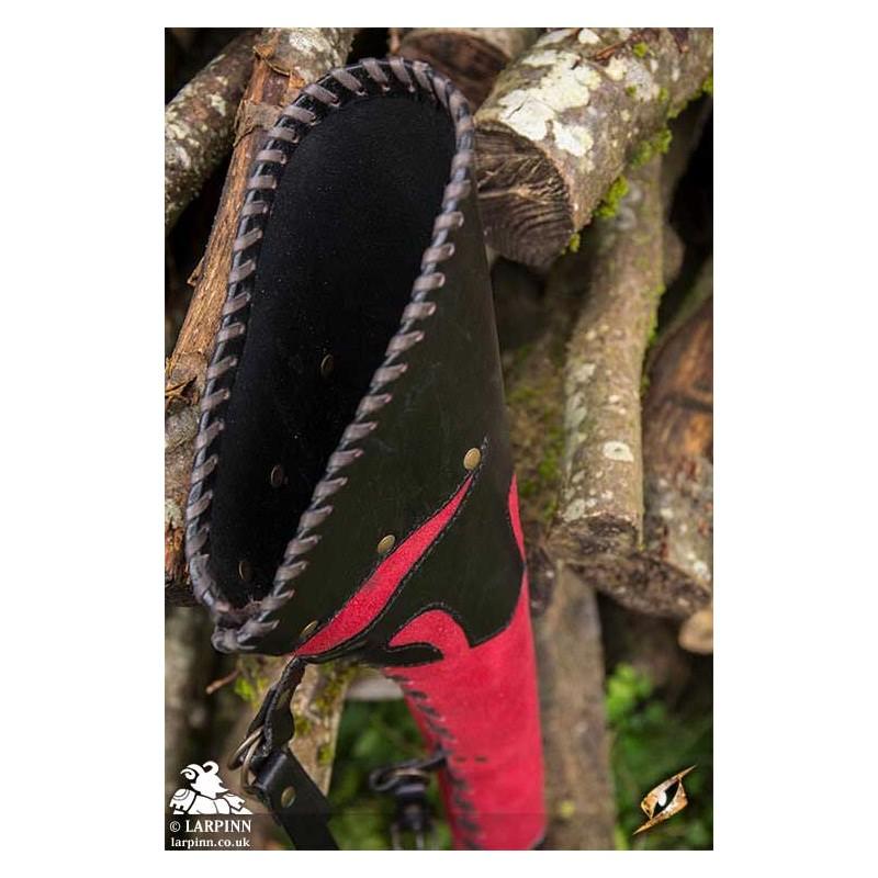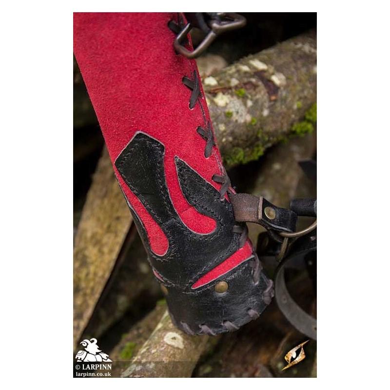 The Ranger Quiver is worn over the shoulder thanks to its 90 cm adjustable leather strap, brass-plated iron buckle, and 32 pre-punched holes. An additional 70 cm adjustable belt anchors the quiver around the waist, or to a baldric or pack. This quiver has a beautifully detailed style and colour and matches other Epic Armoury leather items, making it a good choice for an elf or noble archer with a fat purse.