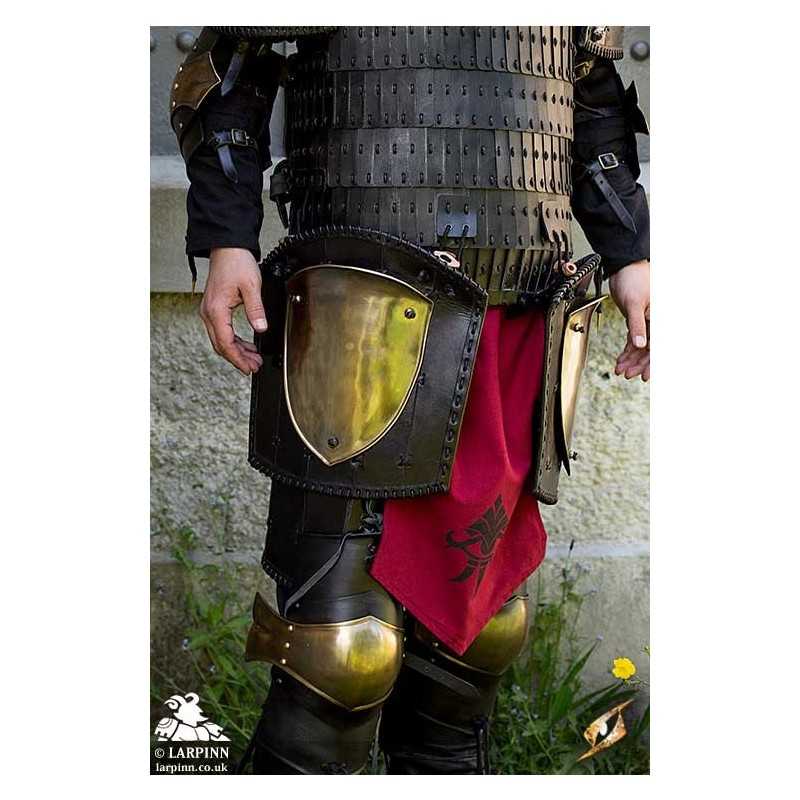Made of 1 mm thick galvanized mild steel and top-grain leather straps and fittings, Ratio thigh Guards are built to withstand the abuse of a LARP with regular leather and metal armour care.